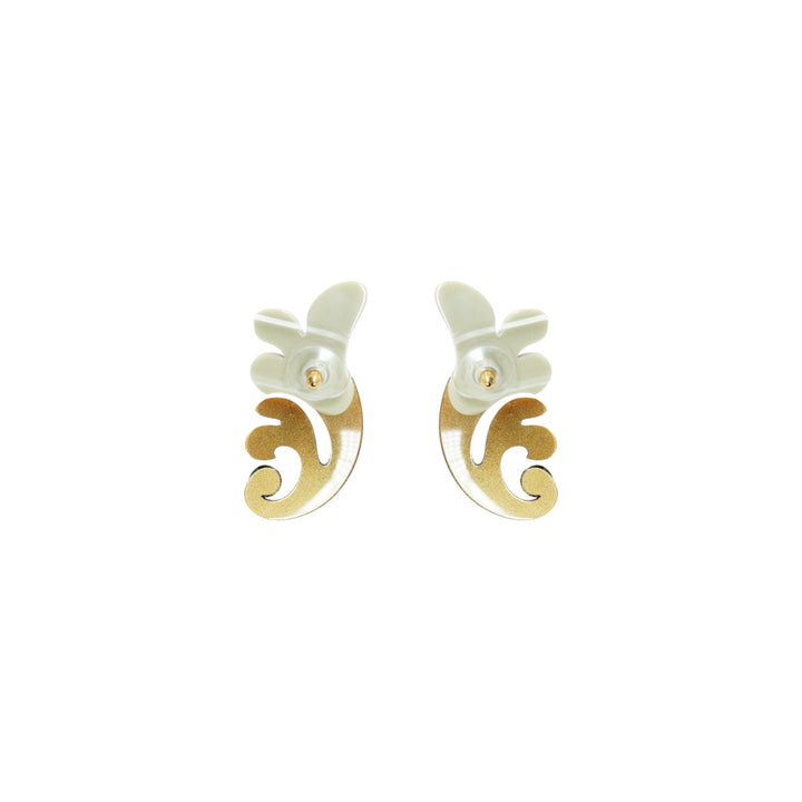 Handcrafted from acrylic, these earrings feature a combination of chain and glass rhinestones. The metals include zamak and brass with a golden finishing and a stainless steel pin for pierced ears.
