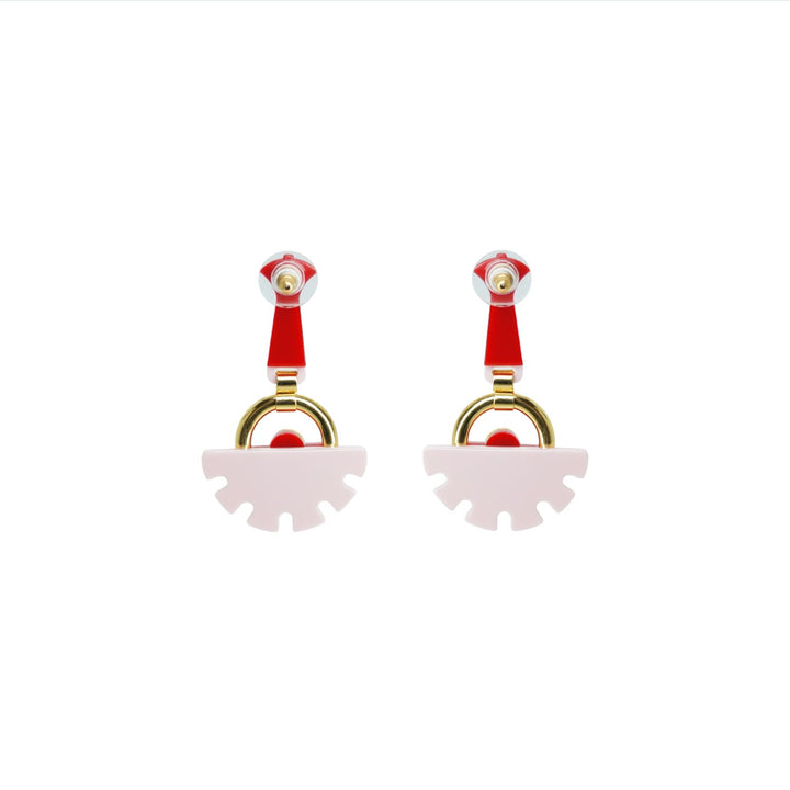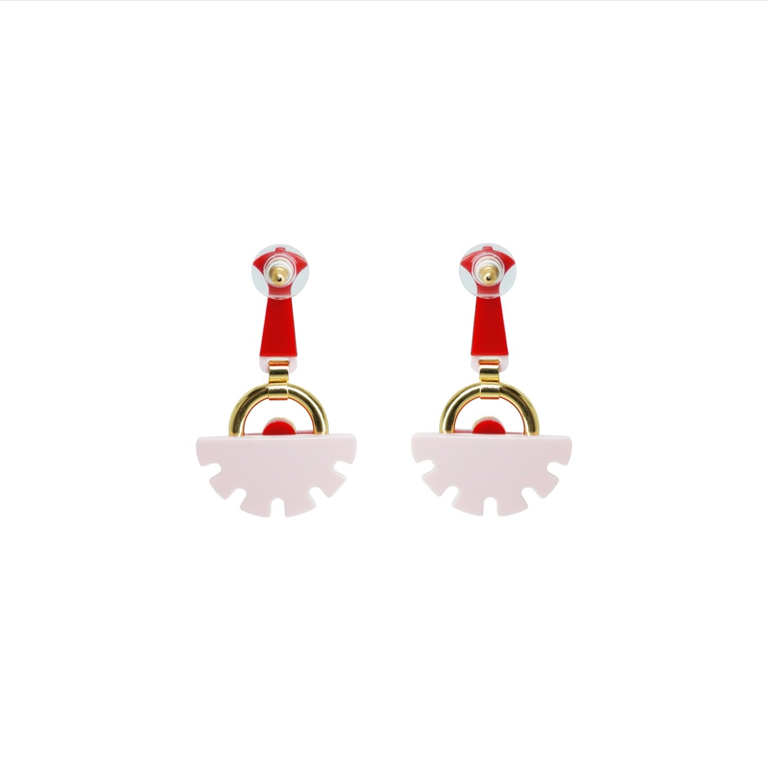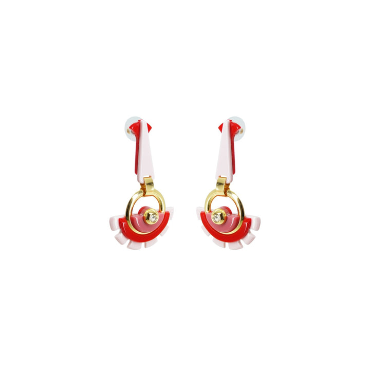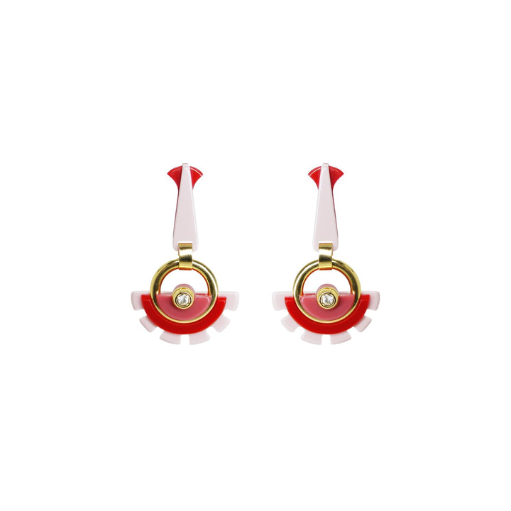 These earrings are handmade from acrylic with a zamak hoop, glass rhinestones, and golden-finished brass metal with a stainless steel pin.