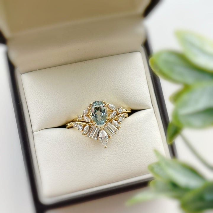 Made in 10K solid yellow gold. Aquamarine: 5x7mm oval, White Topaz: 3x2 marquise, 2mm round