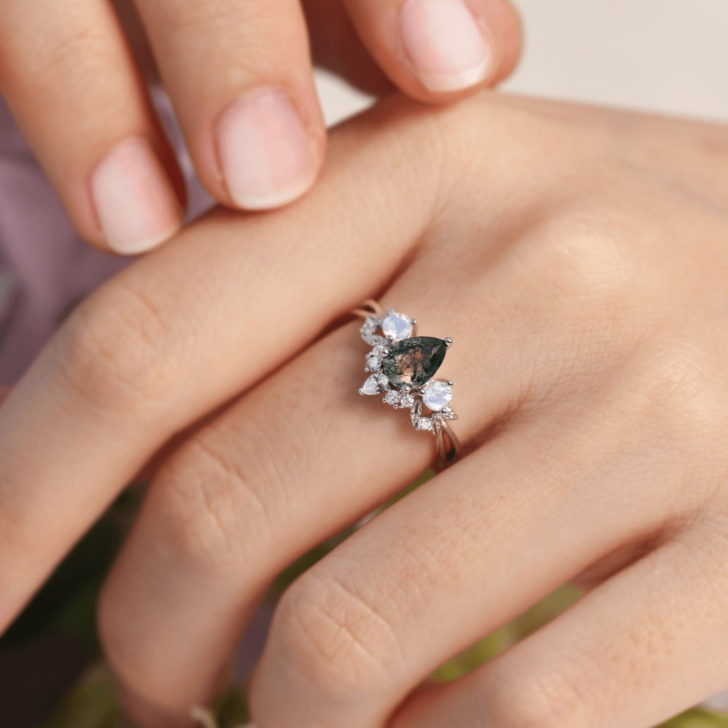 Laurel Grove Moss Agate Moonstone Ring Solid White Gold