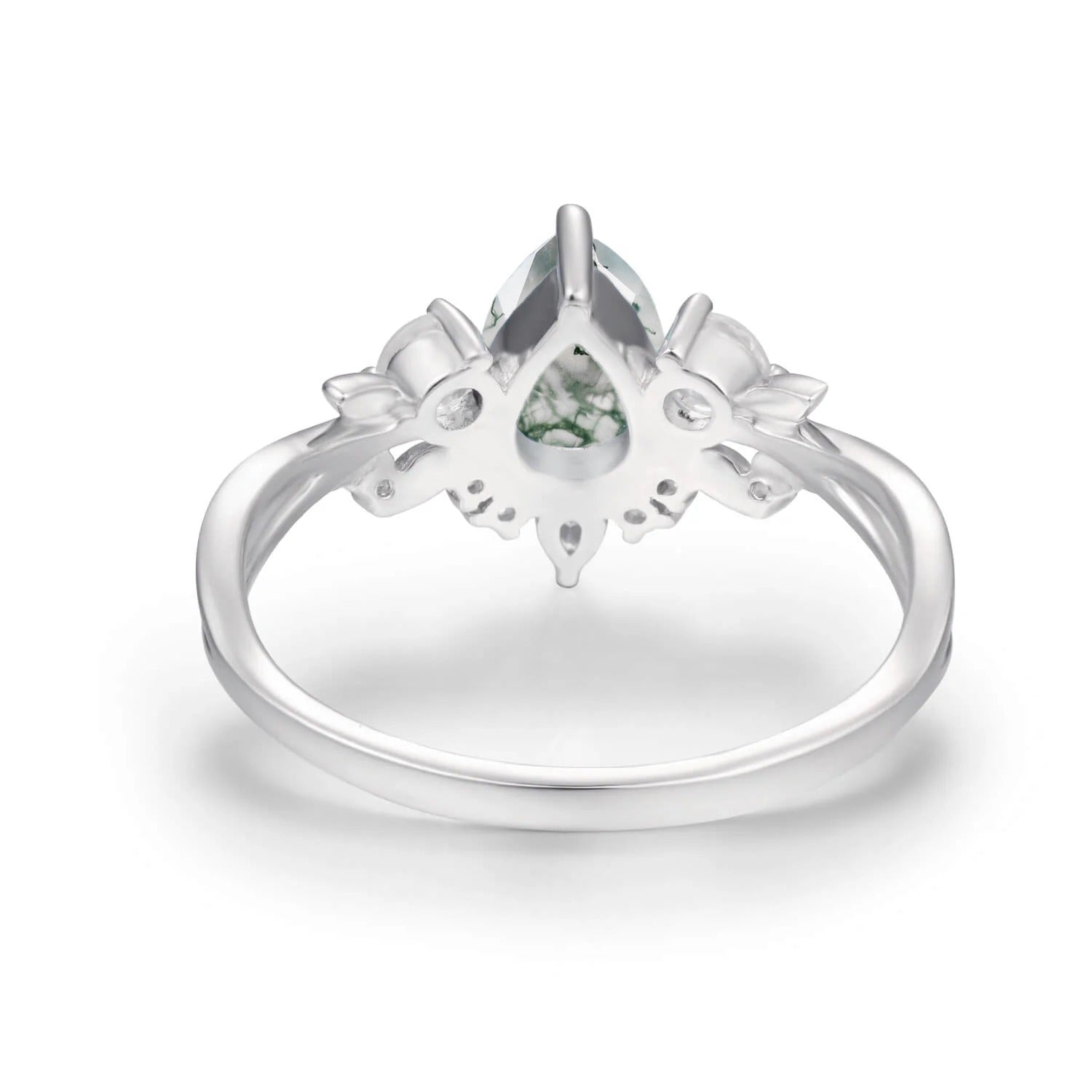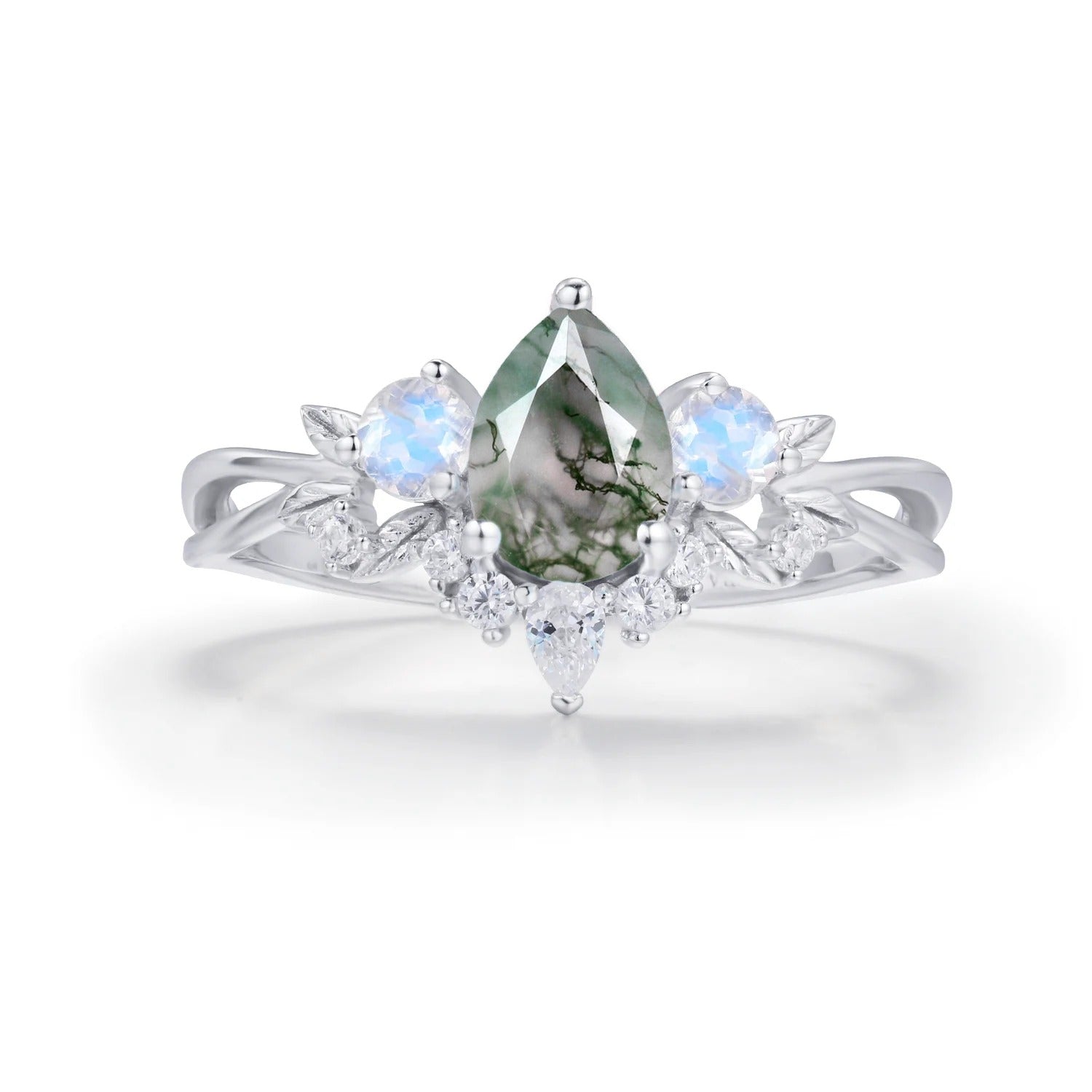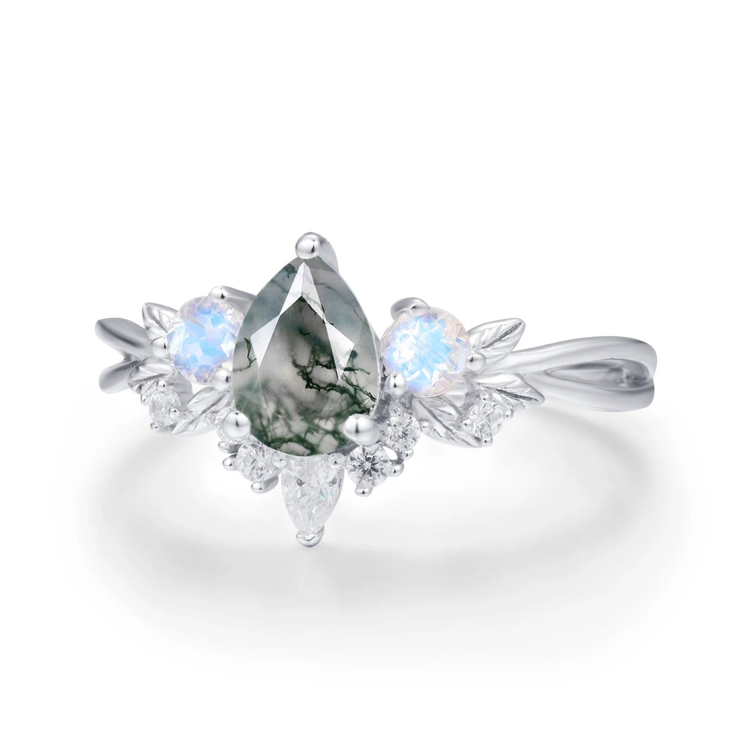 10K Solid White Gold, Moss Agate (pear): 5x7mm, Moonstone (round): 3mm, White Topaz (pear): 3x2mm, White Topaz (round): 1.2-1.5mm
