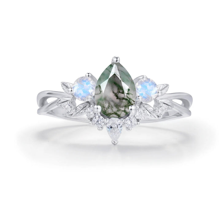 Enchant hearts, make a statement and let your inner light shine with our Laurel Grove Moss Agate Moonstone Ring. This fascinating split band ring showcases a pear-shaped moss agate gemstone adorned by round moonstones, shimmering like moonlit dreams. Enhancing this heavenly symphony are dazzling white topaz gemstones, infusing a unique radiance that captivates at every glance. Let its gleaming charm remind you to embrace life's simple joys, nurture your passions, and illuminate the world with your unique brilliance.