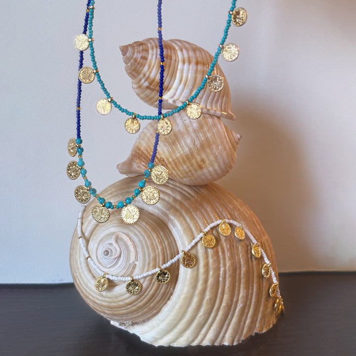This Oia Necklace by Gajú is a beautiful piece that highlights the raw, natural beauty and unique character of each stone. It is crafted with raw lapis lazuli and polished lapis, which are thoughtfully alternated with gold-plated charms. The design feels both timeless and bohemian, drawing on the elegance of nature's imperfections. As a versatile and adjustable piece, it allows for a personalized fit, making it a subtle yet meaningful statement piece that is perfect for any occasion.
