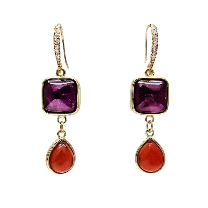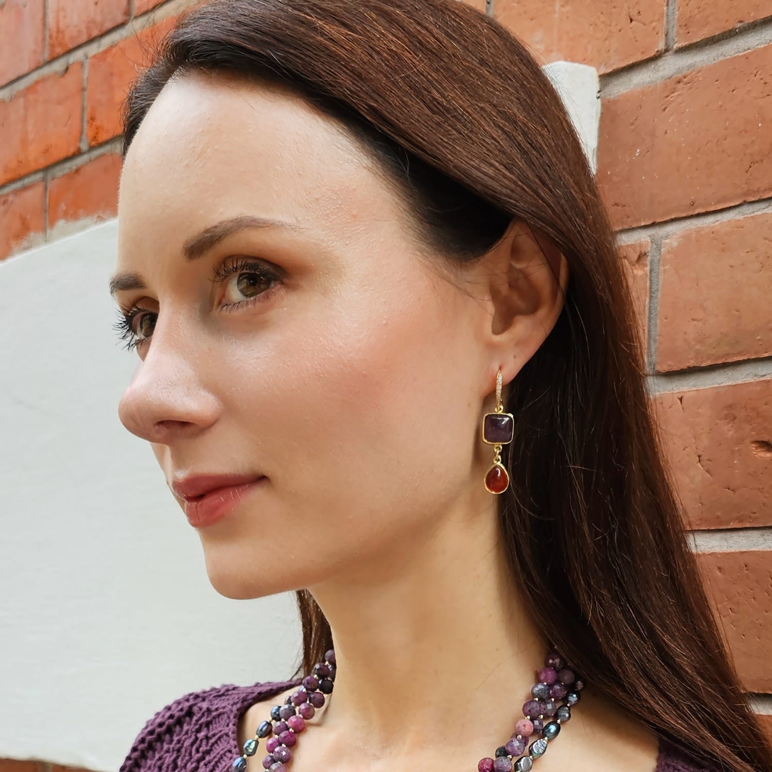 These dangle earrings are made with natural garnet and natural agate and are set in 14K gold plated brass.