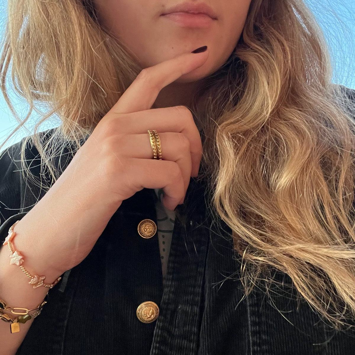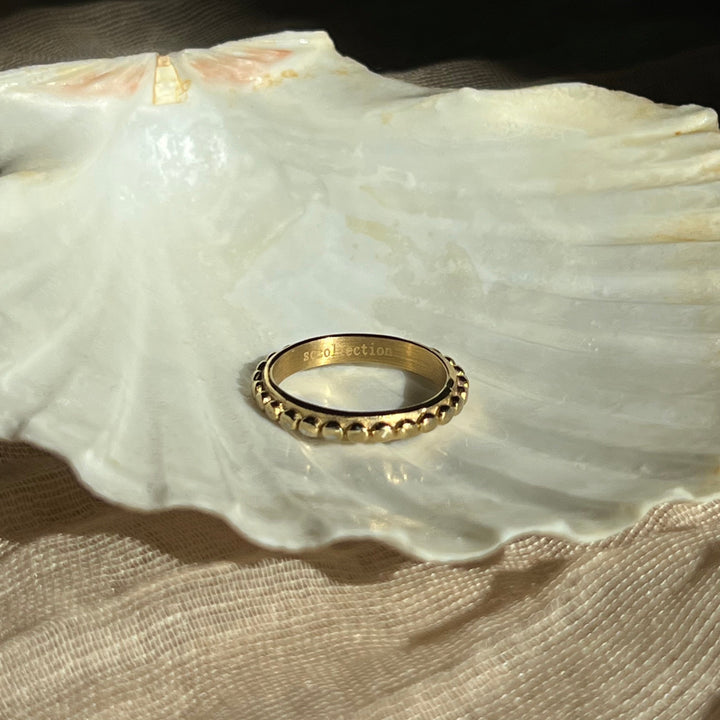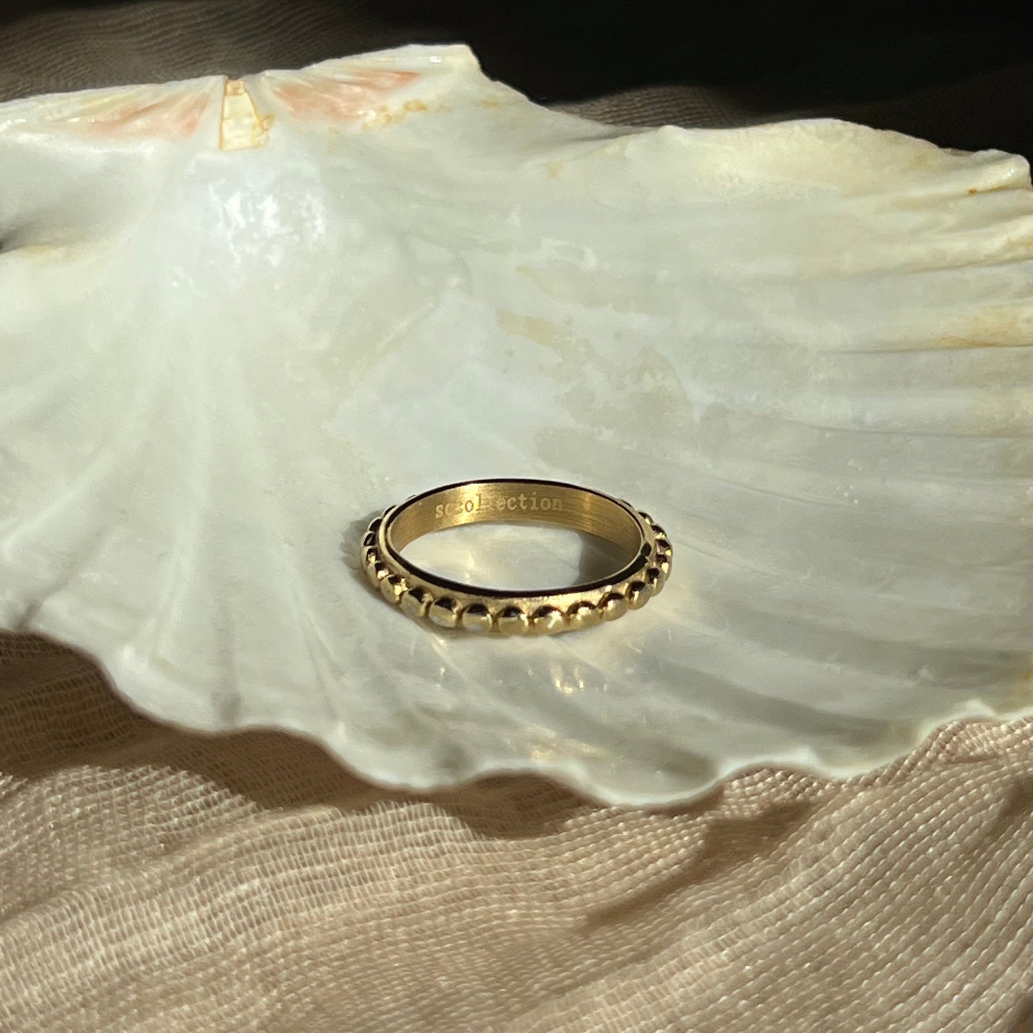 A simple dotted stacker ring to pair with your everyday favorites. This ring has a sleek design for optimal comfort and is made of tarnish-resistant 22k gold vacuum-plated stainless steel. Comes with the sccollection logo engraved inside.