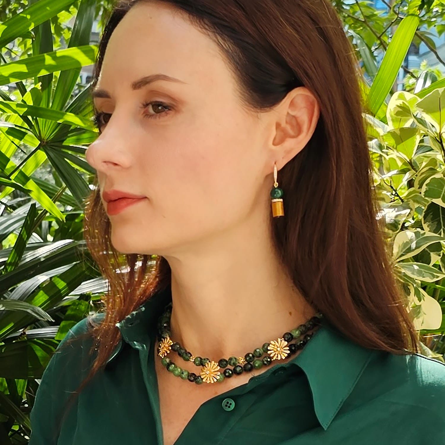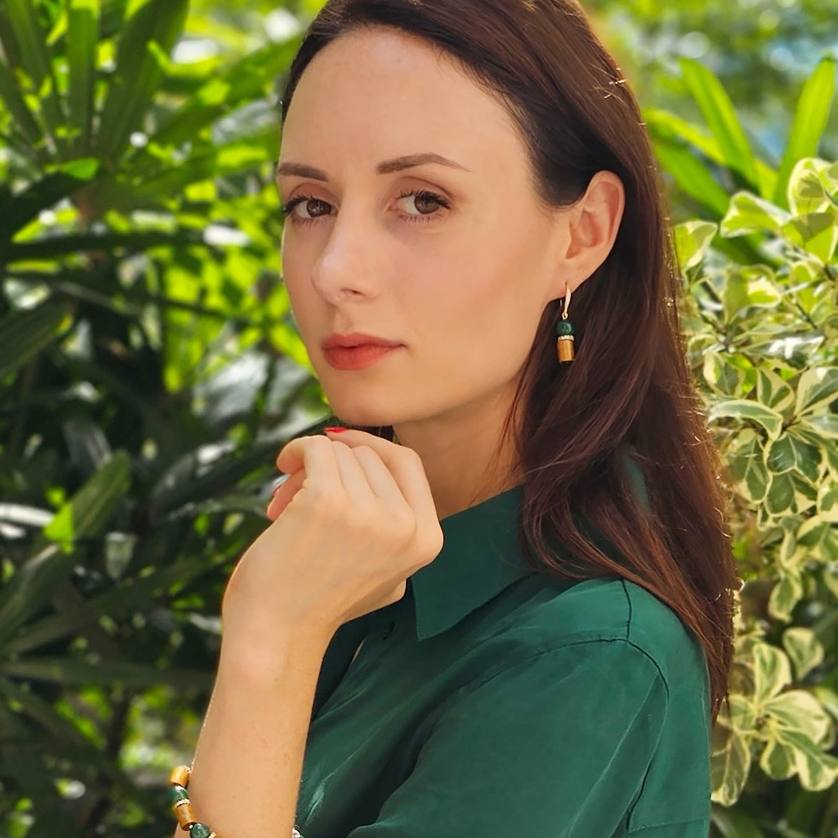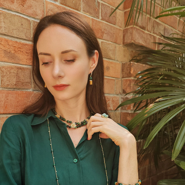These Golden Coral With Malachite Dangle Earrings by Farra are radiant expressions of natural beauty. The warm tones of golden coral meet the rich green depth of malachite, accented with sparkling zircon. Symbolizing balance and transformation, they bring meaningful energy and refined artistry to any look.