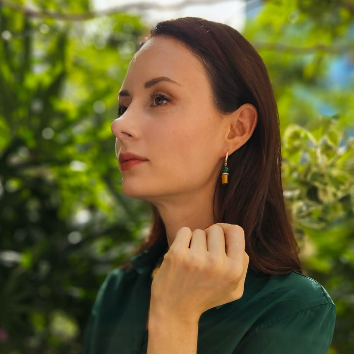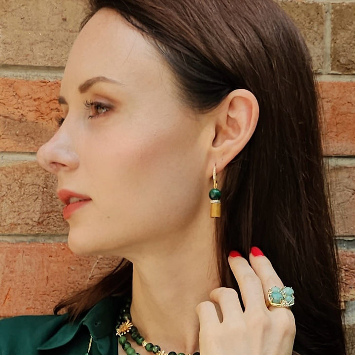 Natural malachite, golden coral, zircon, and 14k gold-plated brass. Dangle earring design.