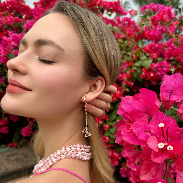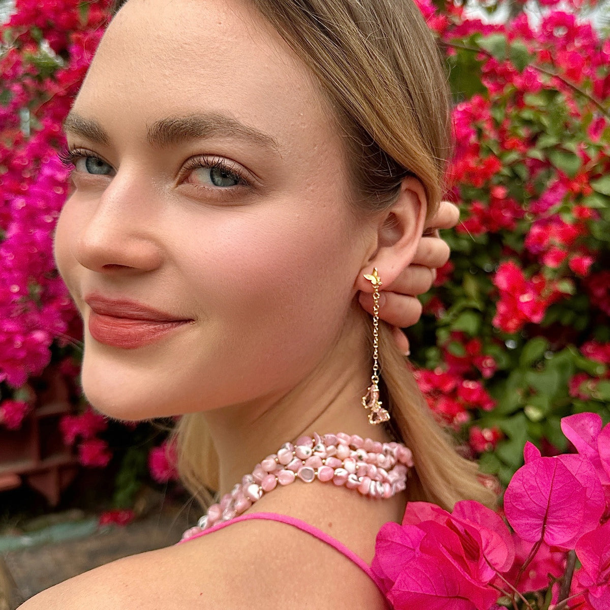 These earrings are crafted from 14K gold-plated brass and are adorned with Swarovski pink crystals.