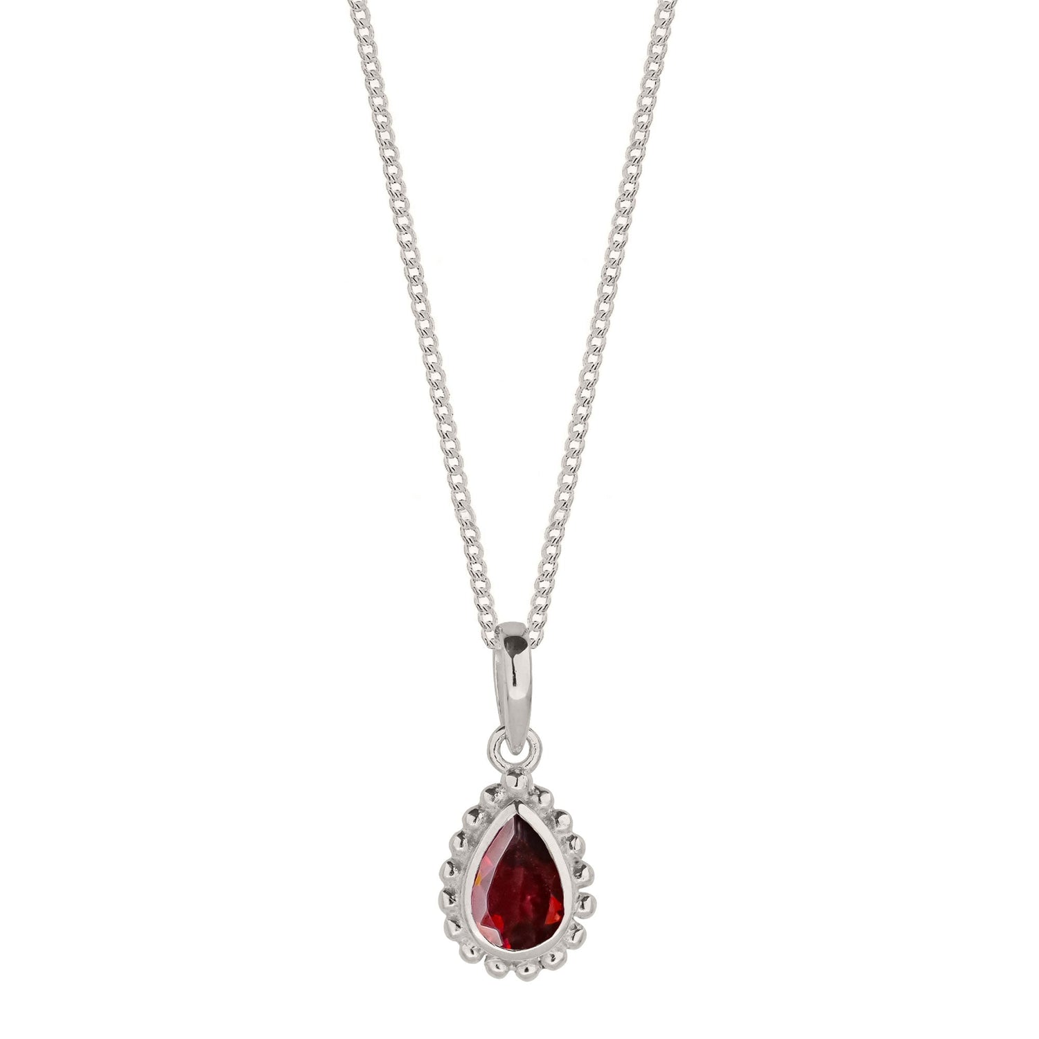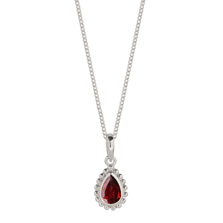 Handcrafted from sterling silver, this necklace features a pear-shaped Rawa setting with a natural garnet stone. The piece is also available in a gold-plated option, with all stones being genuine and therefore potentially varying slightly in color.