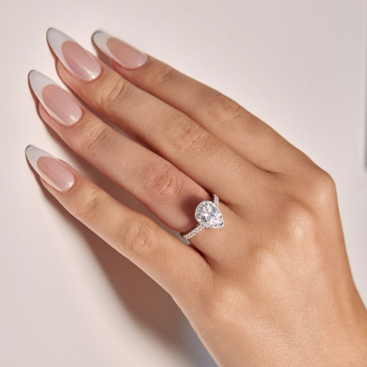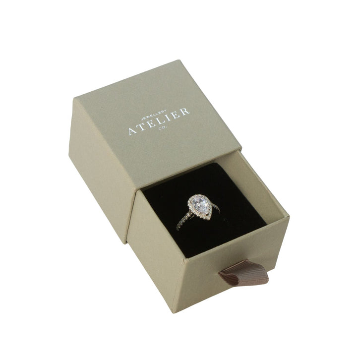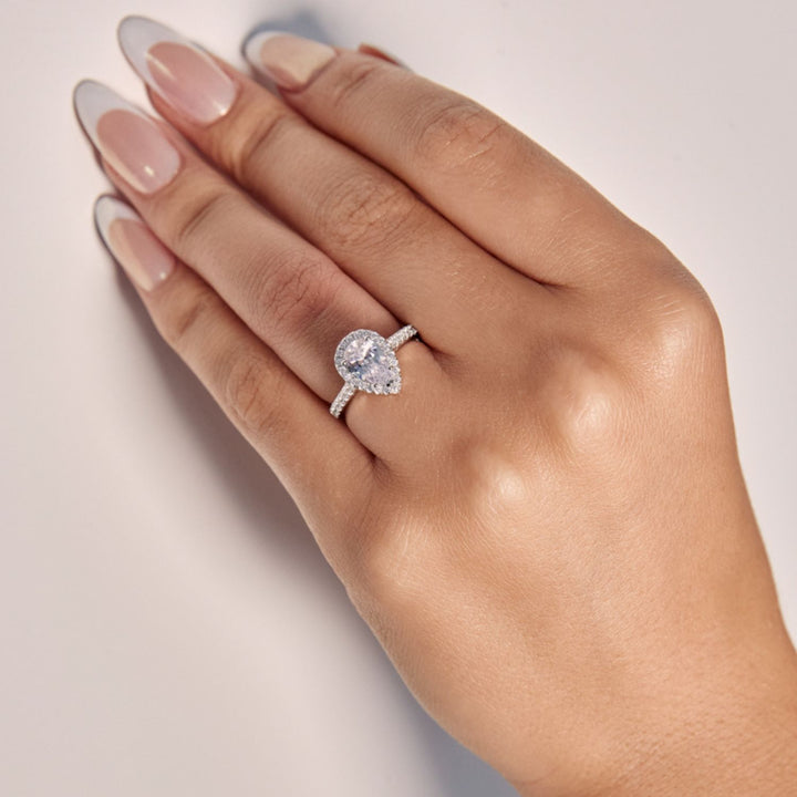 Crafted with precision and dedicated to timeless elegance, this exquisite 2.5ct Pear Cut Pavè Ring shows off the beauty of curves meeting to a point in a graceful teardrop shape. The versatile design allows it to be worn with the point facing either up or down for two unique looks. Set in a delicate pavè band enhancing the beauty and sparkle of the pear cut gemstone, making this a timeless piece of jewellery. This truly is a romantic masterpiece. This ring is further enhanced by a wrap around halo that captures its beauty and sparkle from all angles.