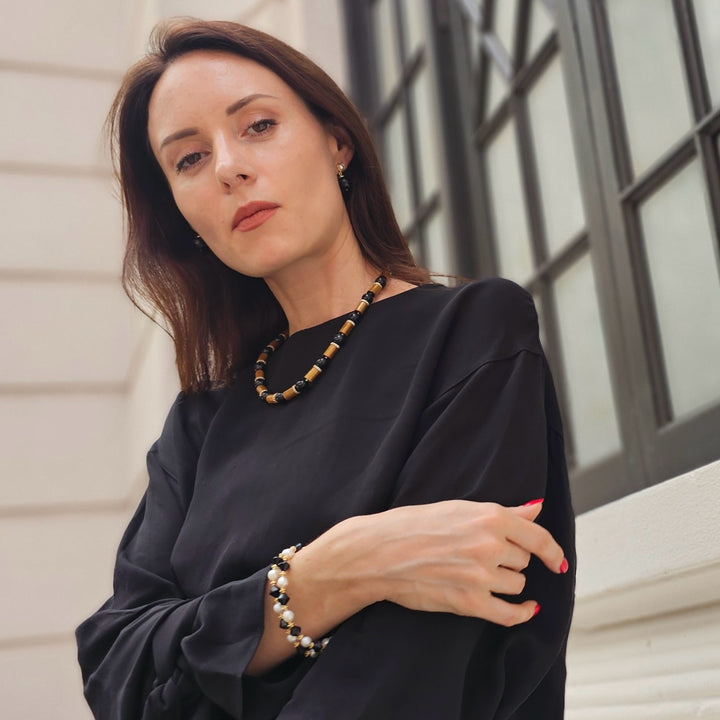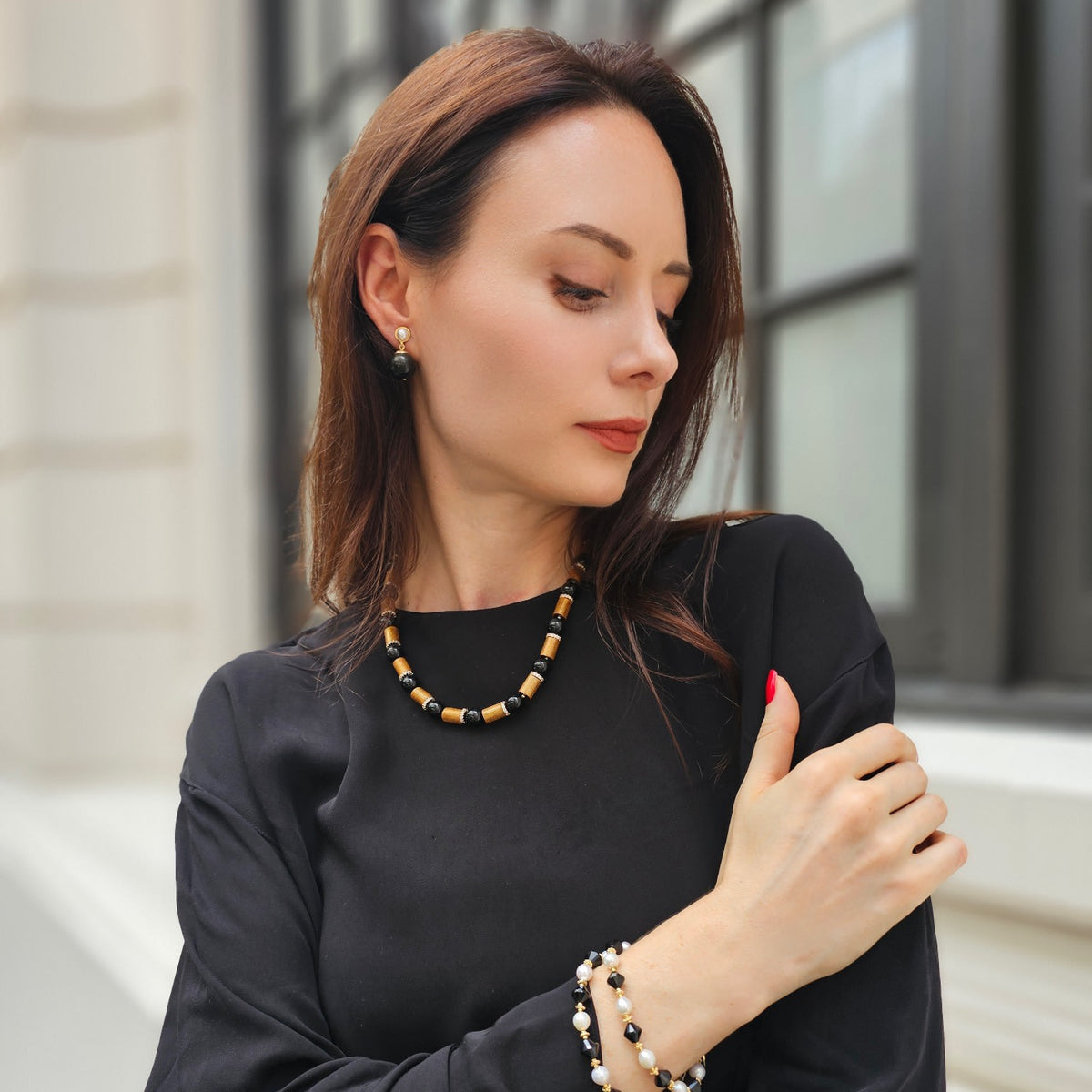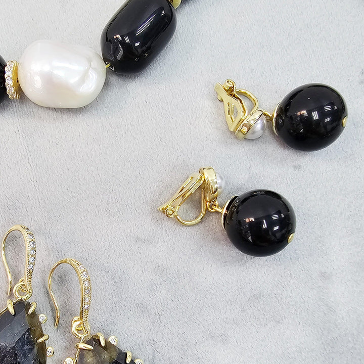 These Black Obsidian With Pearls Clip-On Earrings by Farra are a contemporary and unique accessory. Crafted from sleek black obsidian in a chic, spherical shape, they add a contemporary touch to any outfit. The obsidian is known for its protective properties, making these earrings not only fashionable but also energetically beneficial. The clip-on design provides a comfortable fit without the need for piercings, making them ideal for anyone.