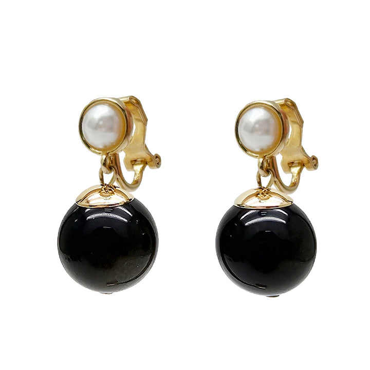 These clip-on earrings are made from natural black obsidian and are 14K gold plated brass. They feature a spherical shape.