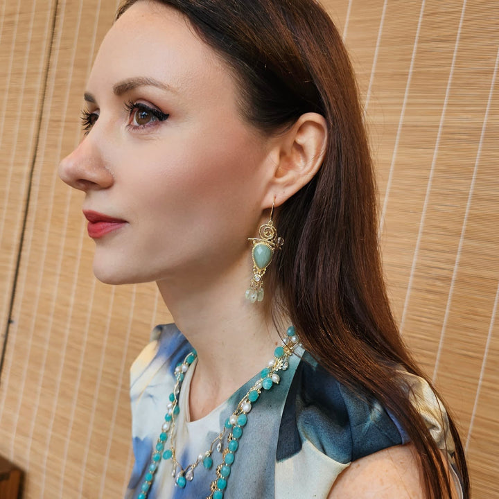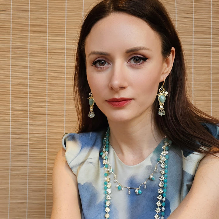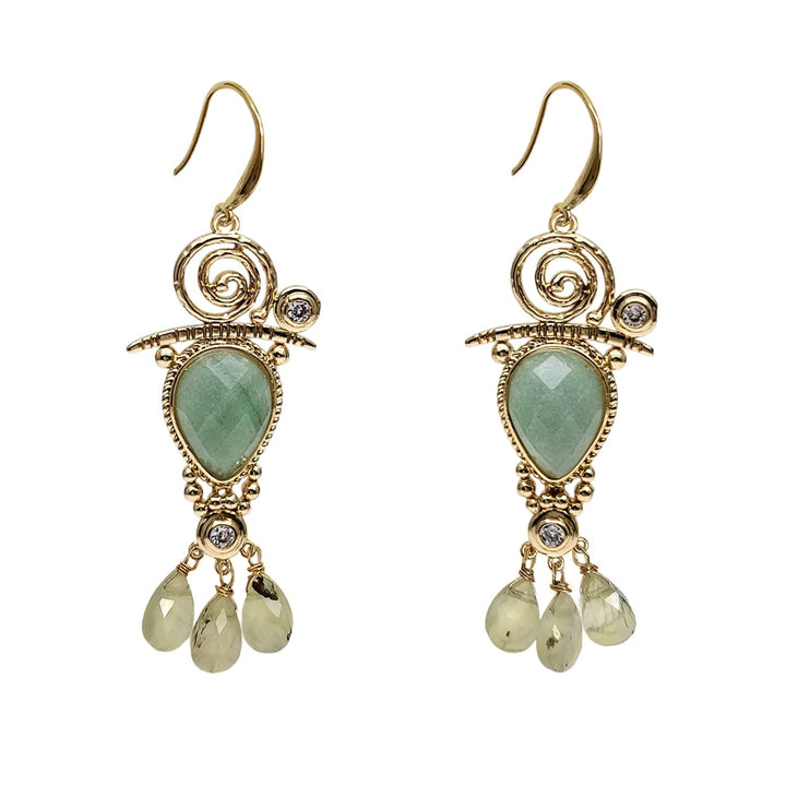 These chandelier earrings feature prehnite gemstones shaped into teardrops. They are set in a gold-tone design with matching gemstone dangles.