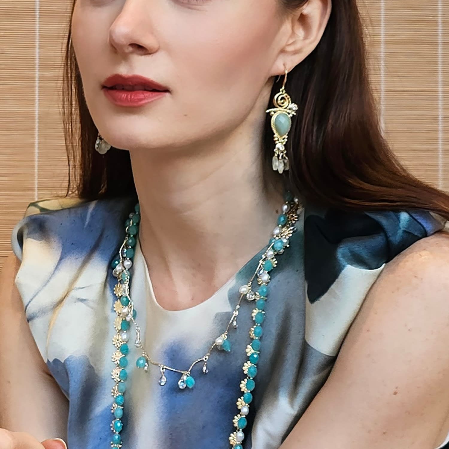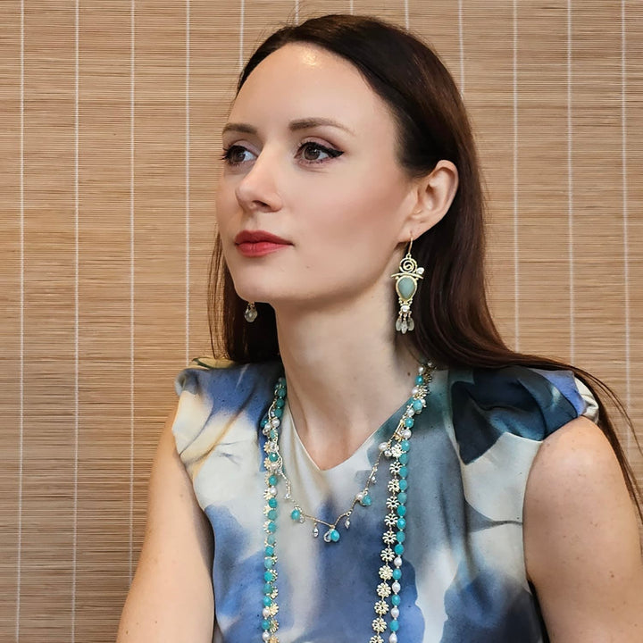 These Green Gemstone Chandelier Earrings by Farra are a stunning accessory that brings a refreshing pop of color to any ensemble. They feature exquisite prehnite gemstones, artfully shaped into elegant teardrops that radiate a soft, ethereal green hue. Intricately set in a stylish gold-tone design with delicate dangles, these earrings create beautiful movement and a captivating charm, perfect for both everyday wear and special occasions.