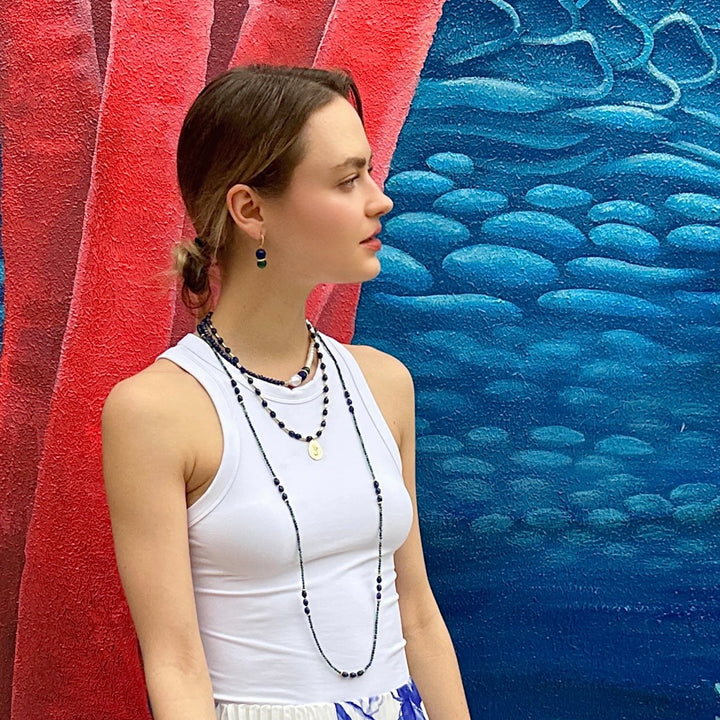 These Blue Lapis With Green Malachite Color Matching Earrings by Farra are an exquisite accessory with a captivating color combination. They combine the mesmerizing allure of vibrant blue lapis lazuli with the rich, verdant hues of green malachite. The result is a harmonious and eye-catching accessory that effortlessly enhances your style. These versatile earrings can be styled for both formal and casual occasions.