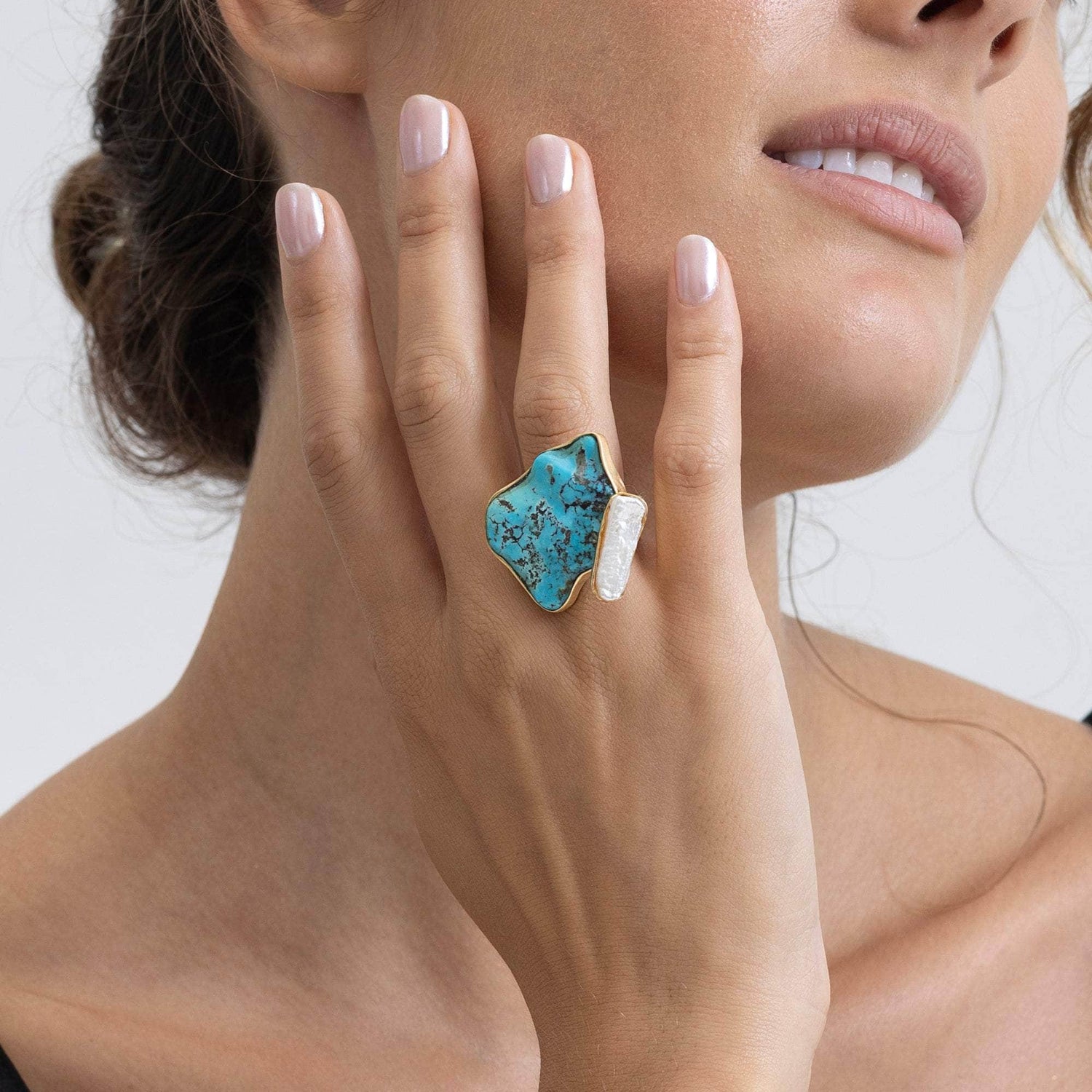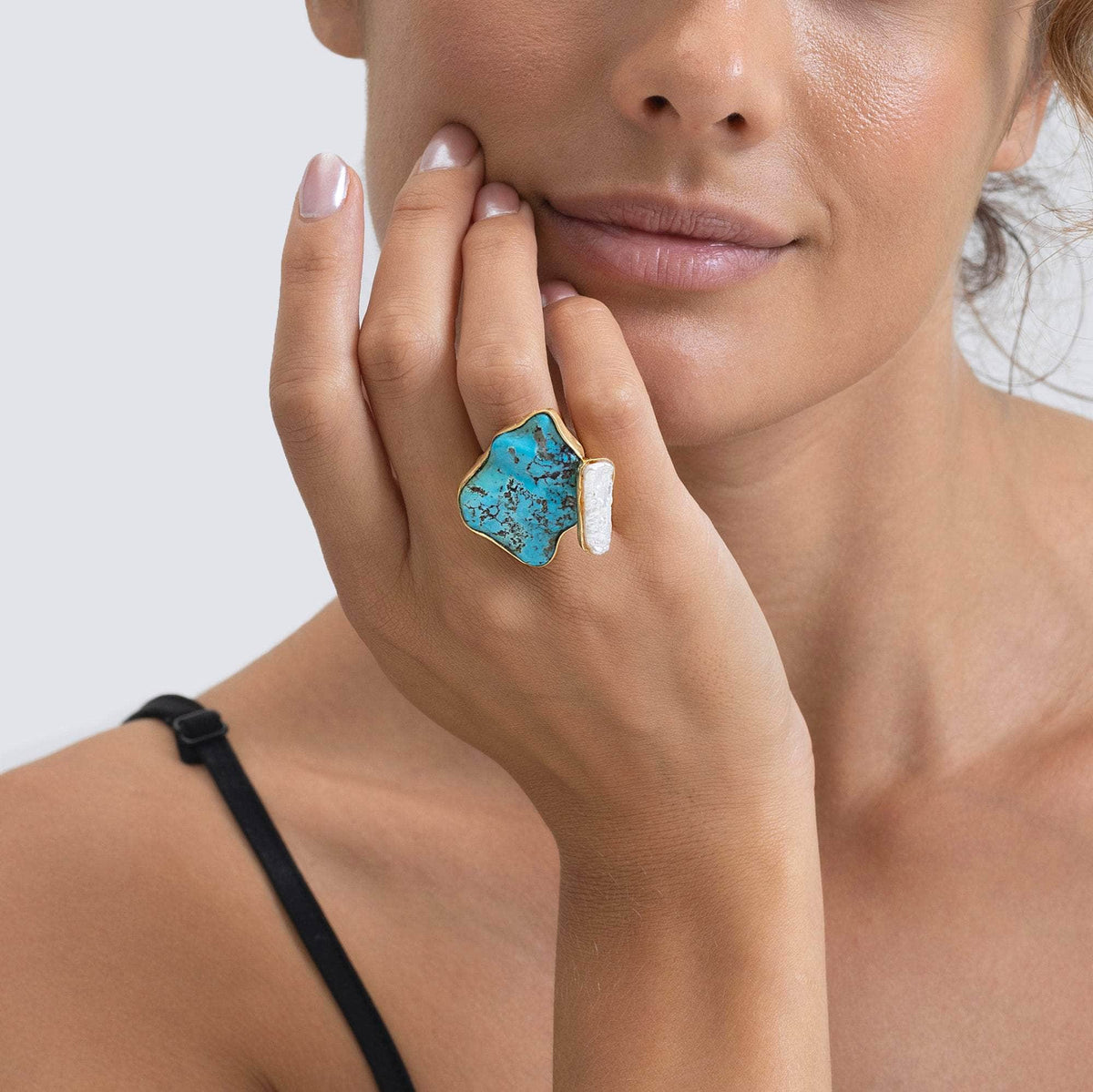 Introducing our one-of-a-kind ring: crafted from 925 Silver plated with 18K Gold, it features two unique gemstones—Keshi Pearl and raw Turquoise. These contrasting elements, different in color, shape, and texture, come together beautifully, just like the diverse parts of a person's character. If this resonates with you, wear this exclusive ring to show that there's more to human nature than simple categories. There's no second copy; only one special person can own it.