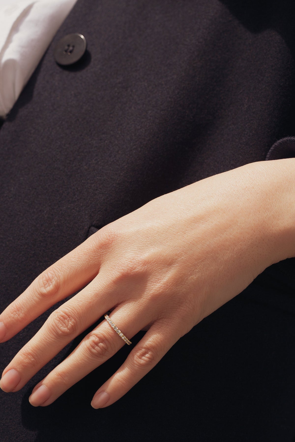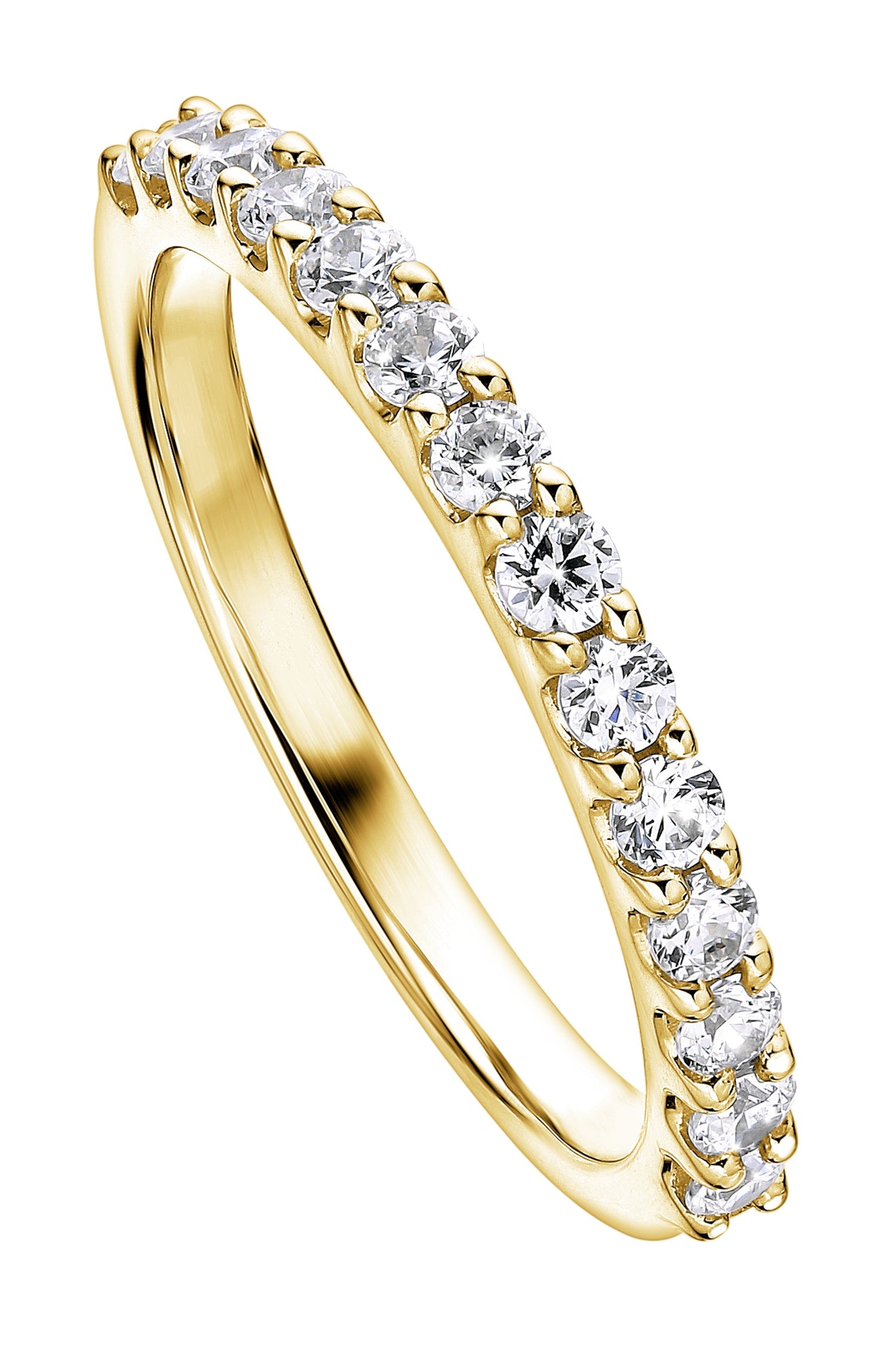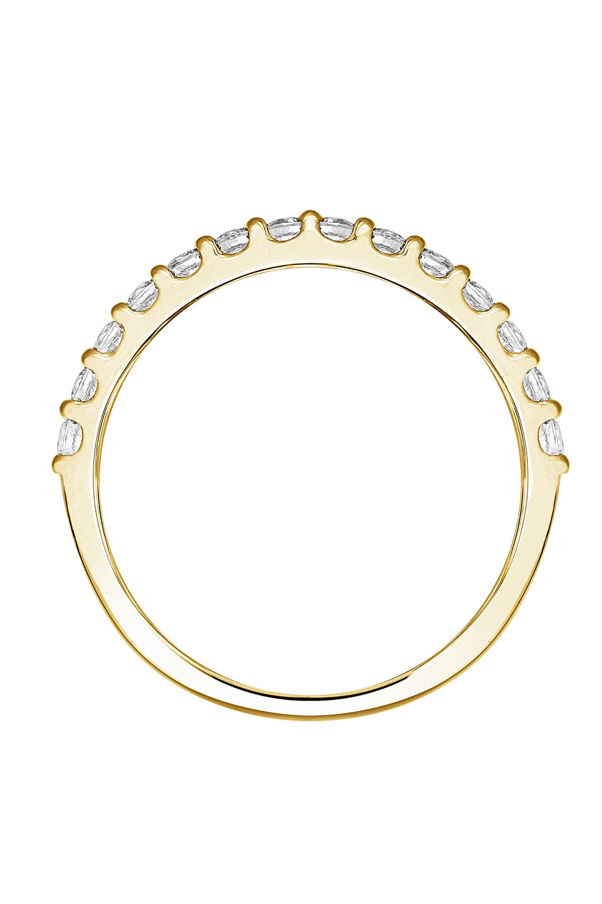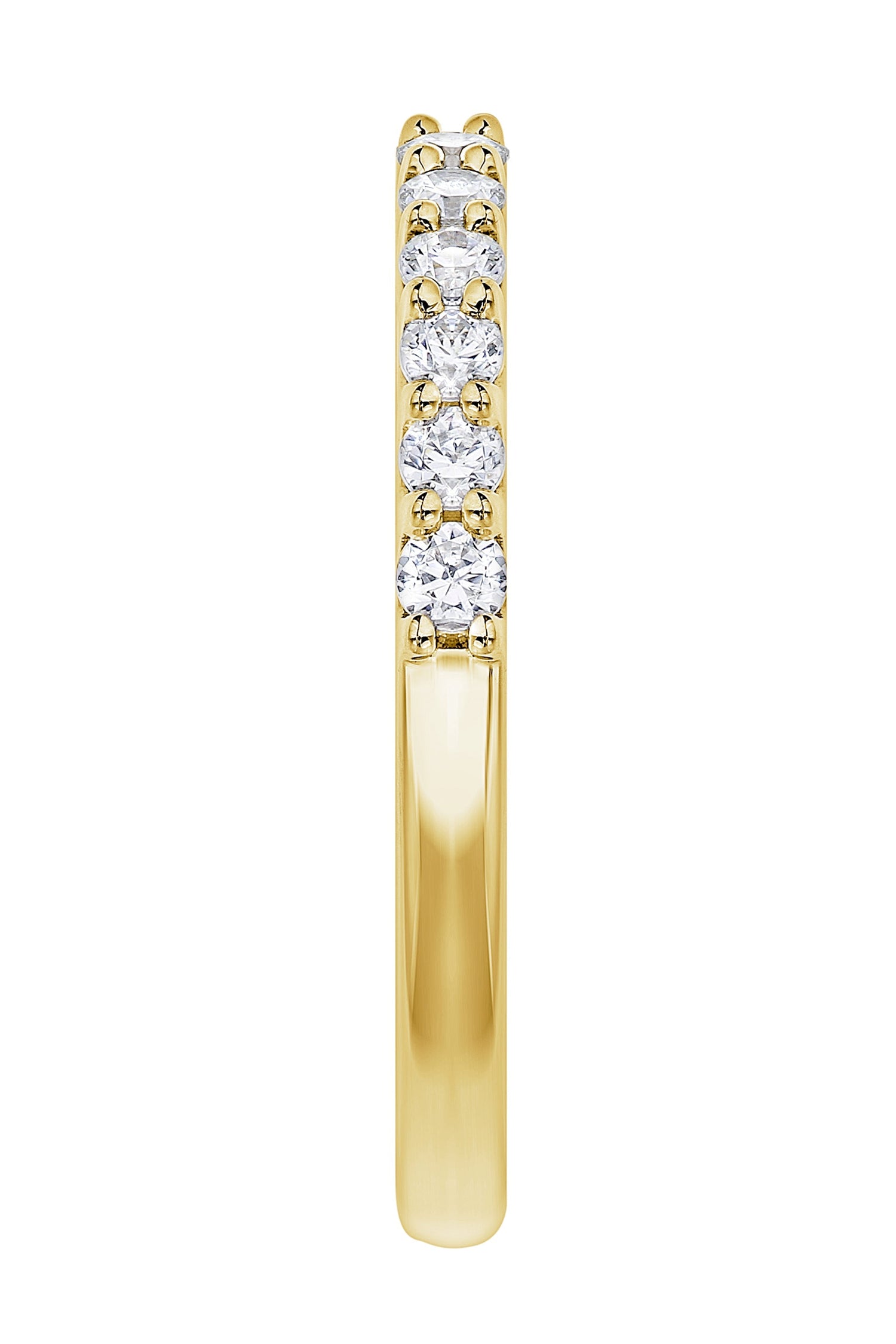 Our Odette ring is wonderfully crafted in 9 carat yellow gold and set with a row of claw set sparkling lab grown diamonds. This elegant piece can be worn alone or as a matching band to one of our beautiful engagement rings.
