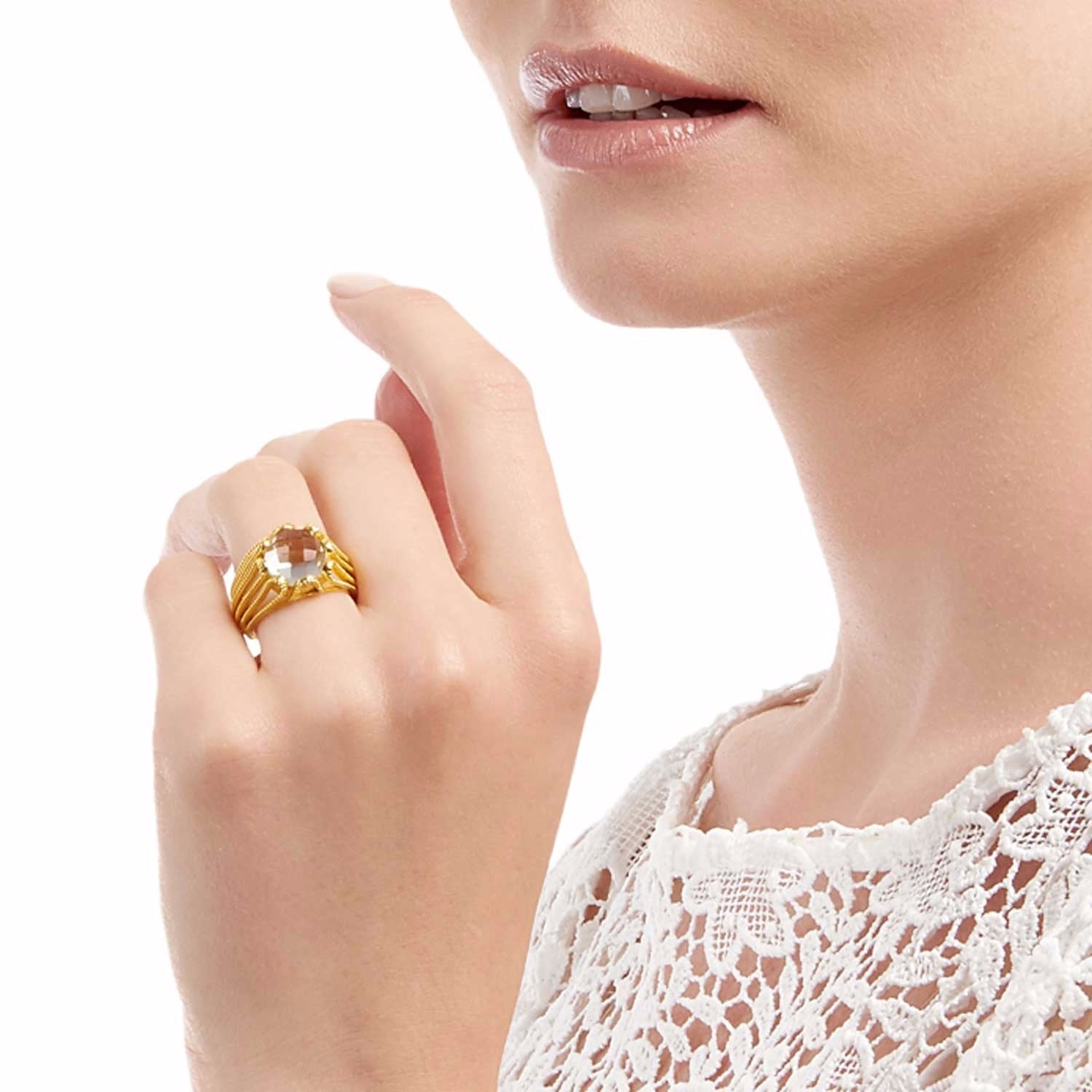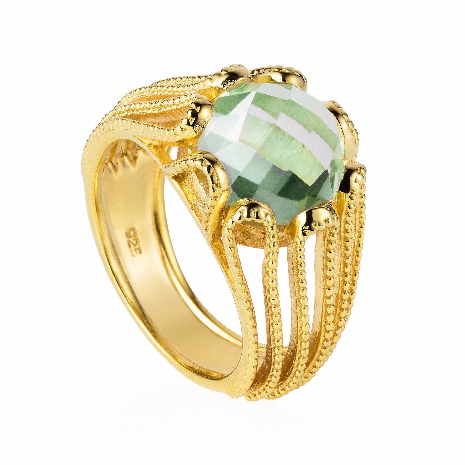Award-winning cocktail ring with a captivating design. A striking gemstone has been meticulously hand set in a 18ct Gold Vermeil frame plated on Sterling Silver. This elegant cocktail ring is inspired by a signet ring. The designer has reinterpreted the classical shape and applied contrasting feminine details, giving the design a contemporary and fresh look and feel. The ring shaft consists of several strand with pearl droplets, making this piece truly original and unique. The centrepiece of the design is a Green Amethyst gemstone featuring a multifaceted cut to bring out the vibrancy and clarity of the stone.