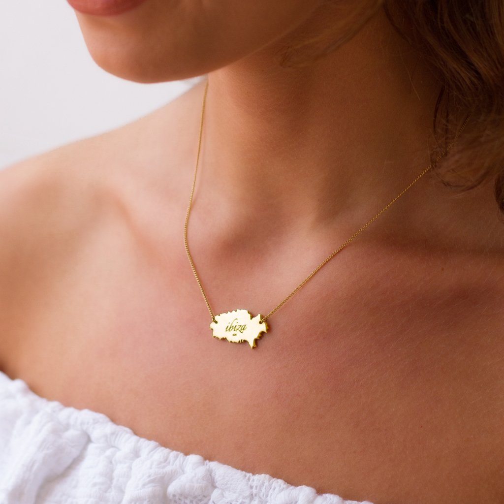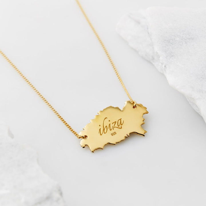 Handmade in sterling silver with 18ct gold vermeil. Set with cubic zirconia stones. Pendant engraved with “Ibiza”.