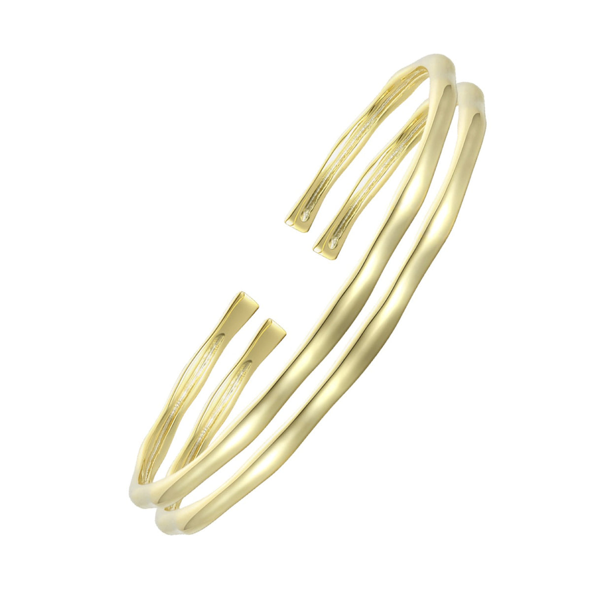 This cuff bracelet is crafted from 14k gold-plated metal and has a relief structure with bumps and dents.