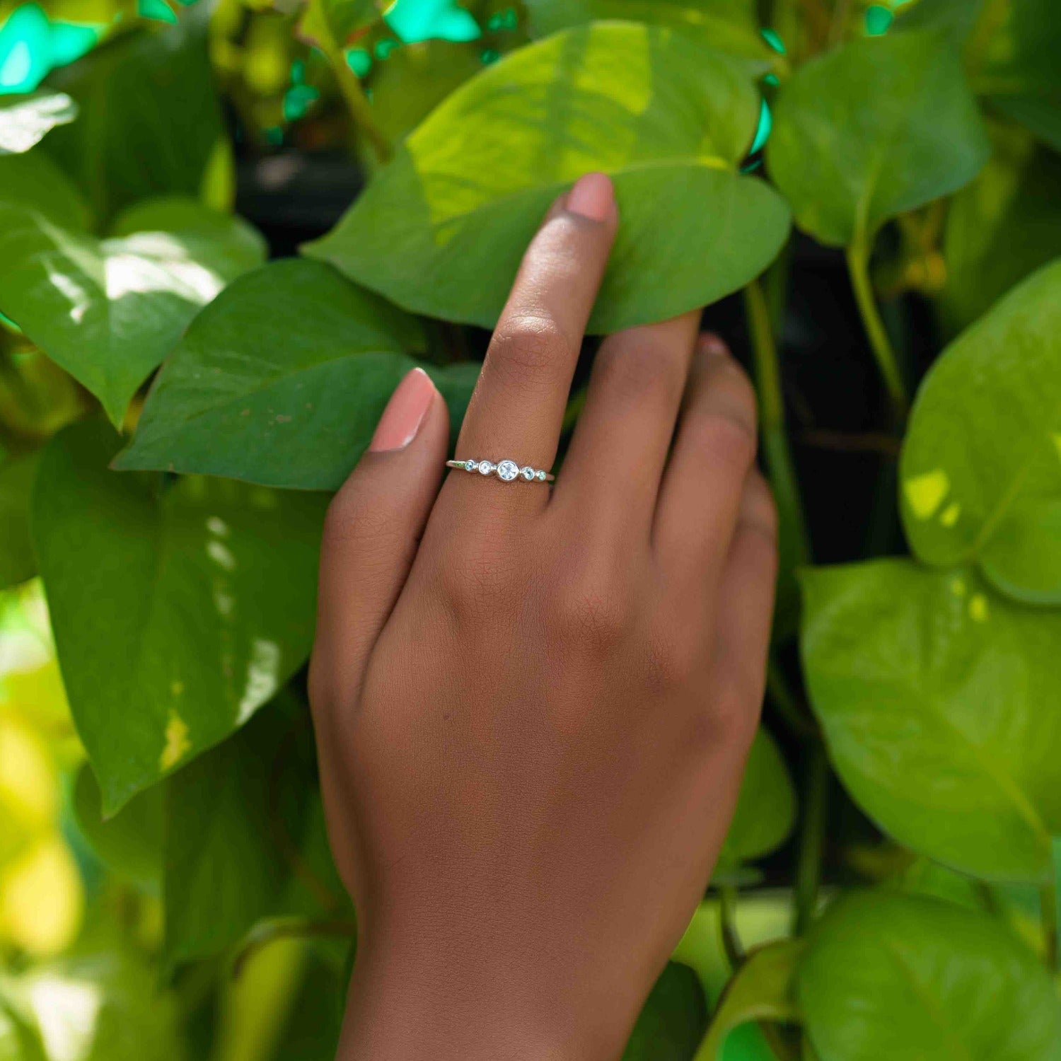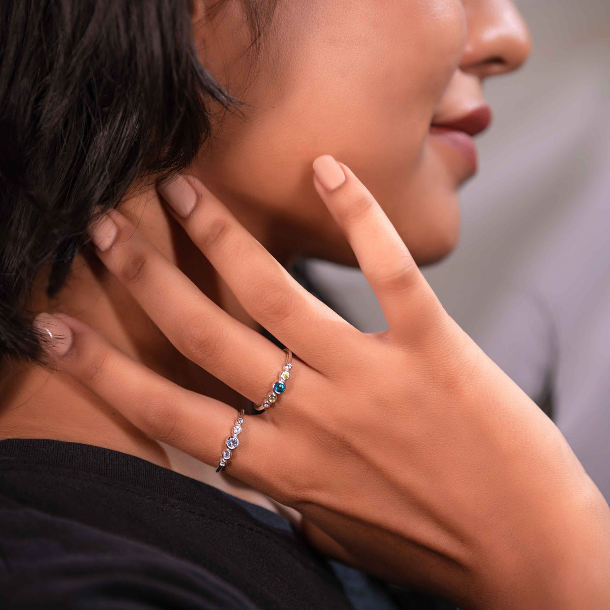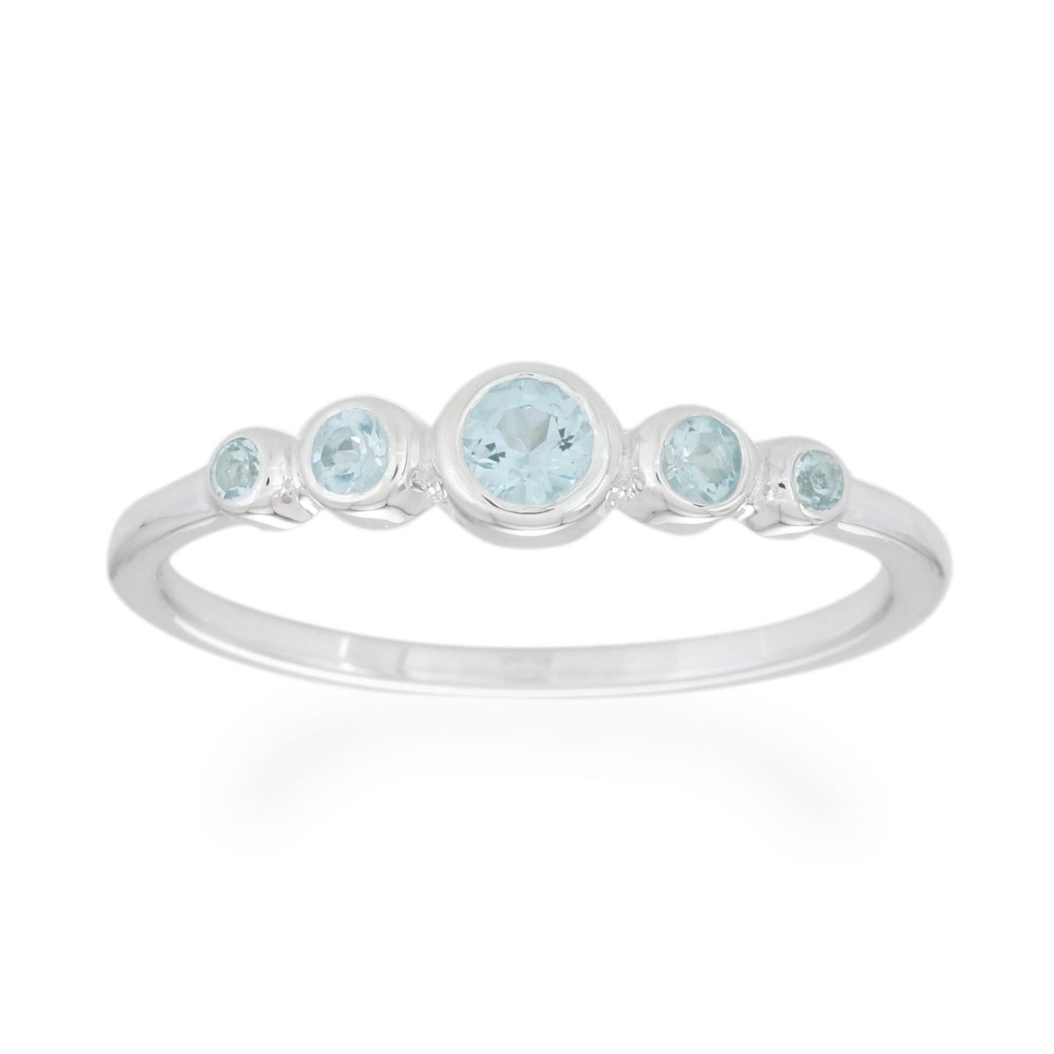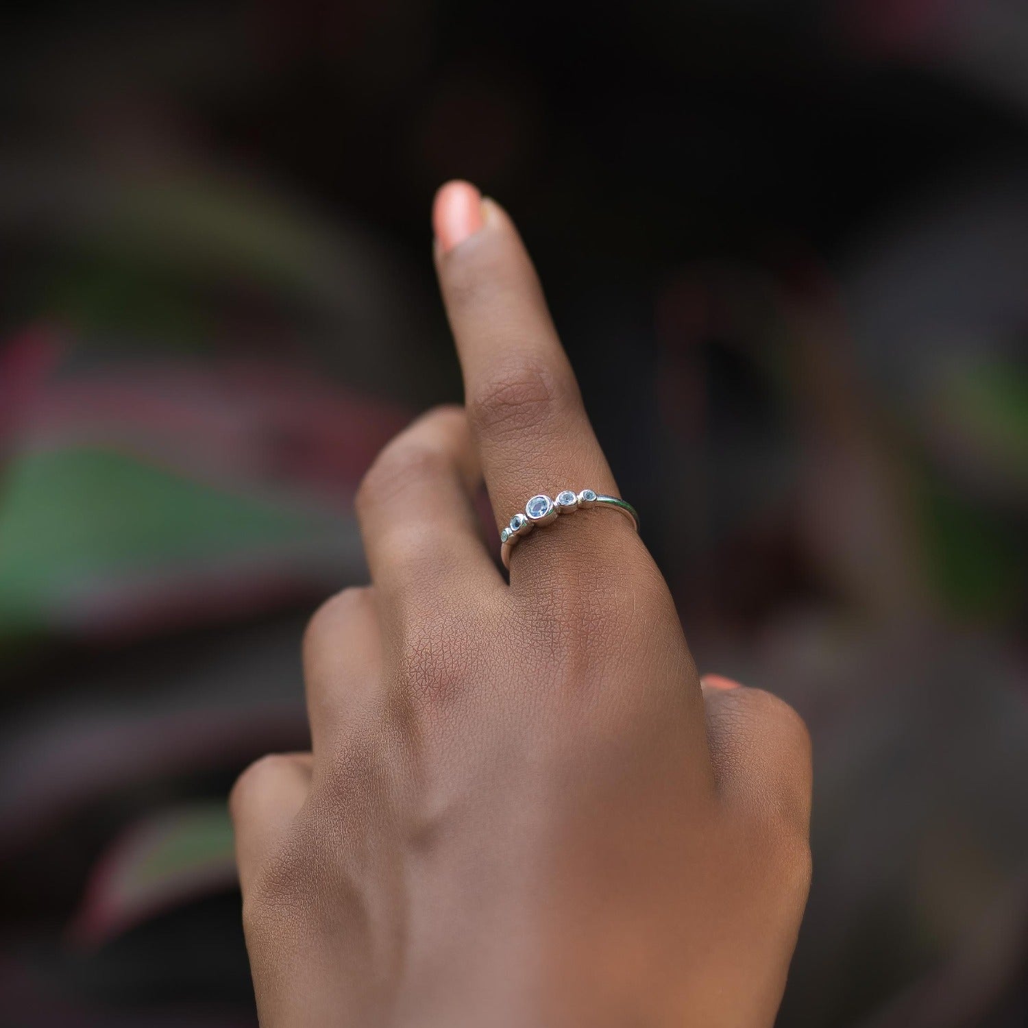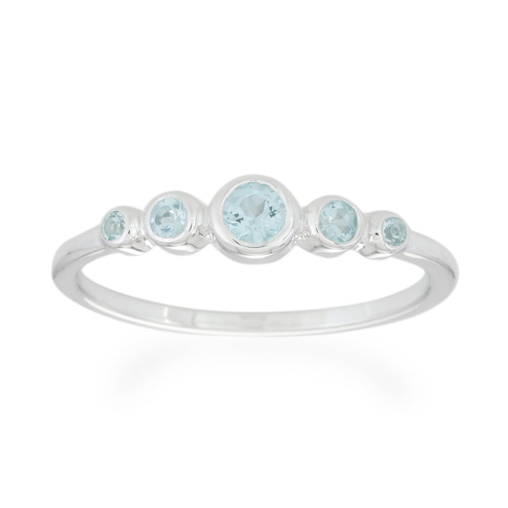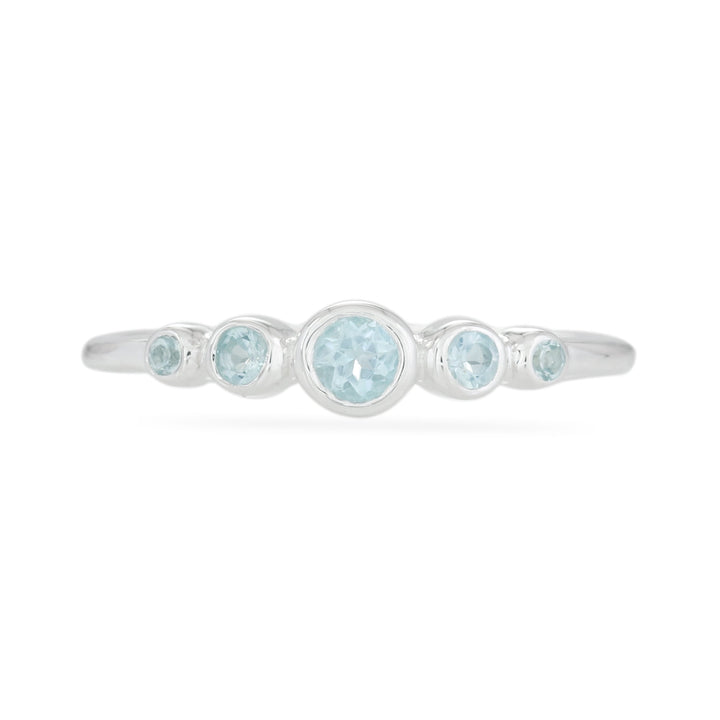 Our graduated 5-stones ring with beautiful aqua blue gemstone is crafted in recycled sterling silver to add a subtle glow and tranquillity to your fingers. Wear it solo for a minimal charm or experiment with other gemstones and stacking rings to curate a story of your own. Sky Blue Topaz: A December birthstone that symbolizes honesty, clarity of feelings, and deep emotional attachment. Featured in a bezel setting.