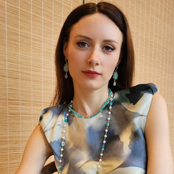 These Teardrop Amazonite Dangle Earrings by Farra are a perfect blend of natural beauty and refined elegance. They feature stunning teardrop-shaped amazonite stones that showcase unique patterns and soothing blue-green hues. Each stone is delicately framed in a gold-tone setting, with a charming amazonite dangle that creates graceful movement. Lightweight and comfortable, these earrings are a sophisticated choice for both casual outings and special occasions.