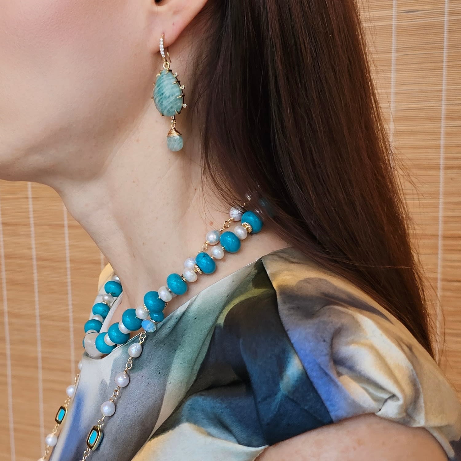 These earrings are crafted with gold-tone settings and feature natural teardrop-shaped amazonite stones.