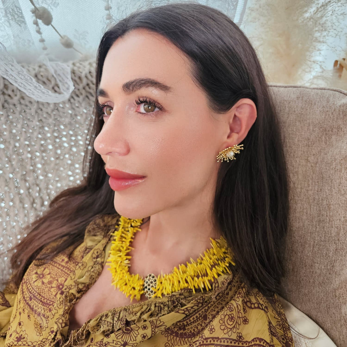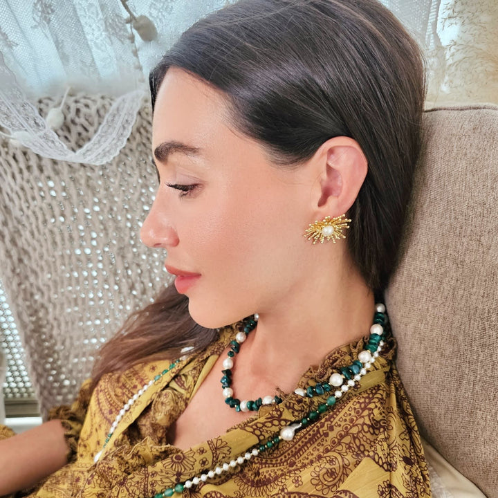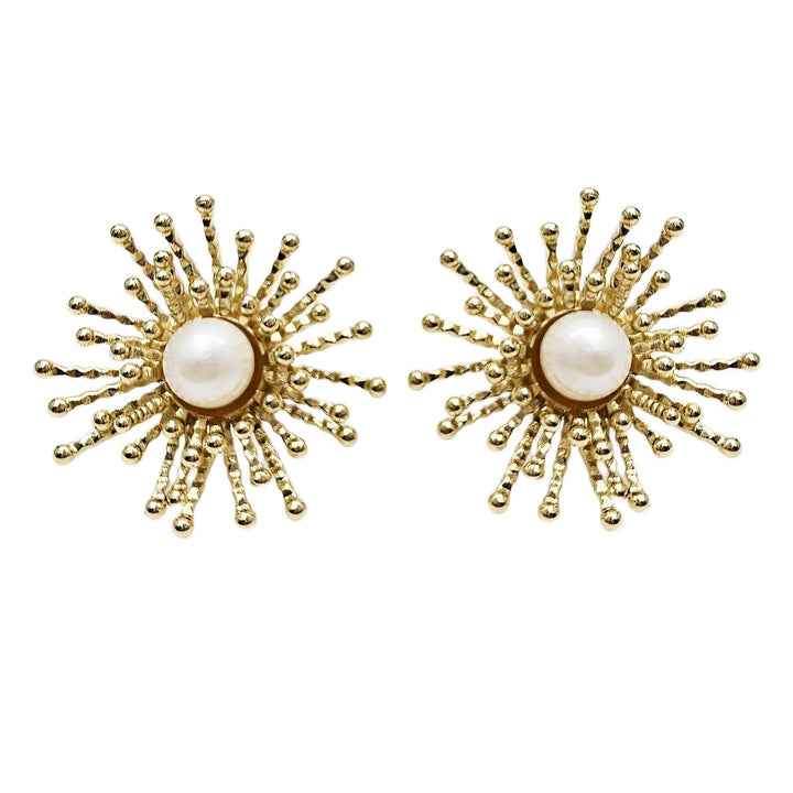 These Flower Setting Pearls Stud Earrings by Farra are a delightful blend of elegance and whimsy. The earrings feature a radiant flower design with gold-toned accents surrounding a lustrous freshwater pearl at the center. The intricate detailing adds dimension, making these studs a standout accessory for any outfit. Lightweight and comfortable for all-day wear, their timeless design ensures versatility, allowing you to effortlessly elevate your style.