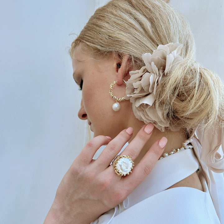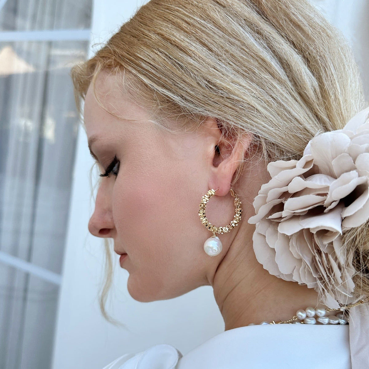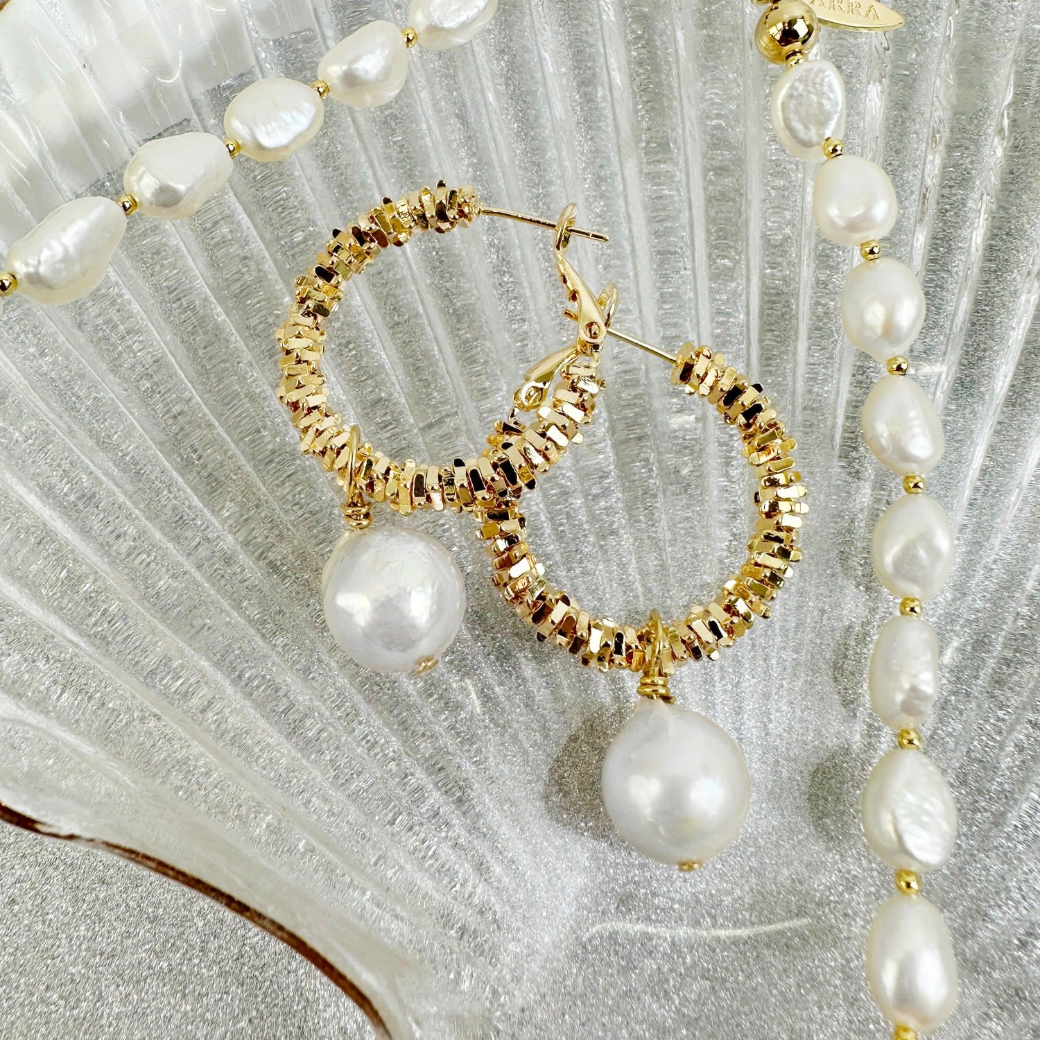 These earrings are crafted from genuine freshwater pearls and metal rings.