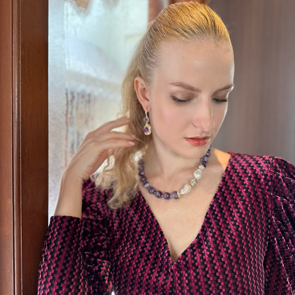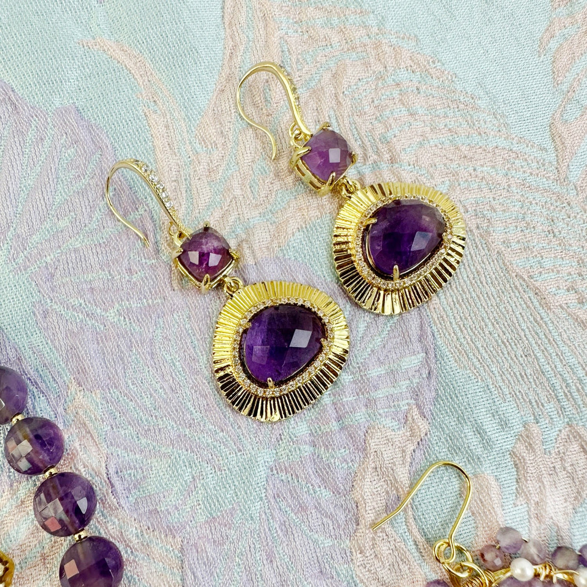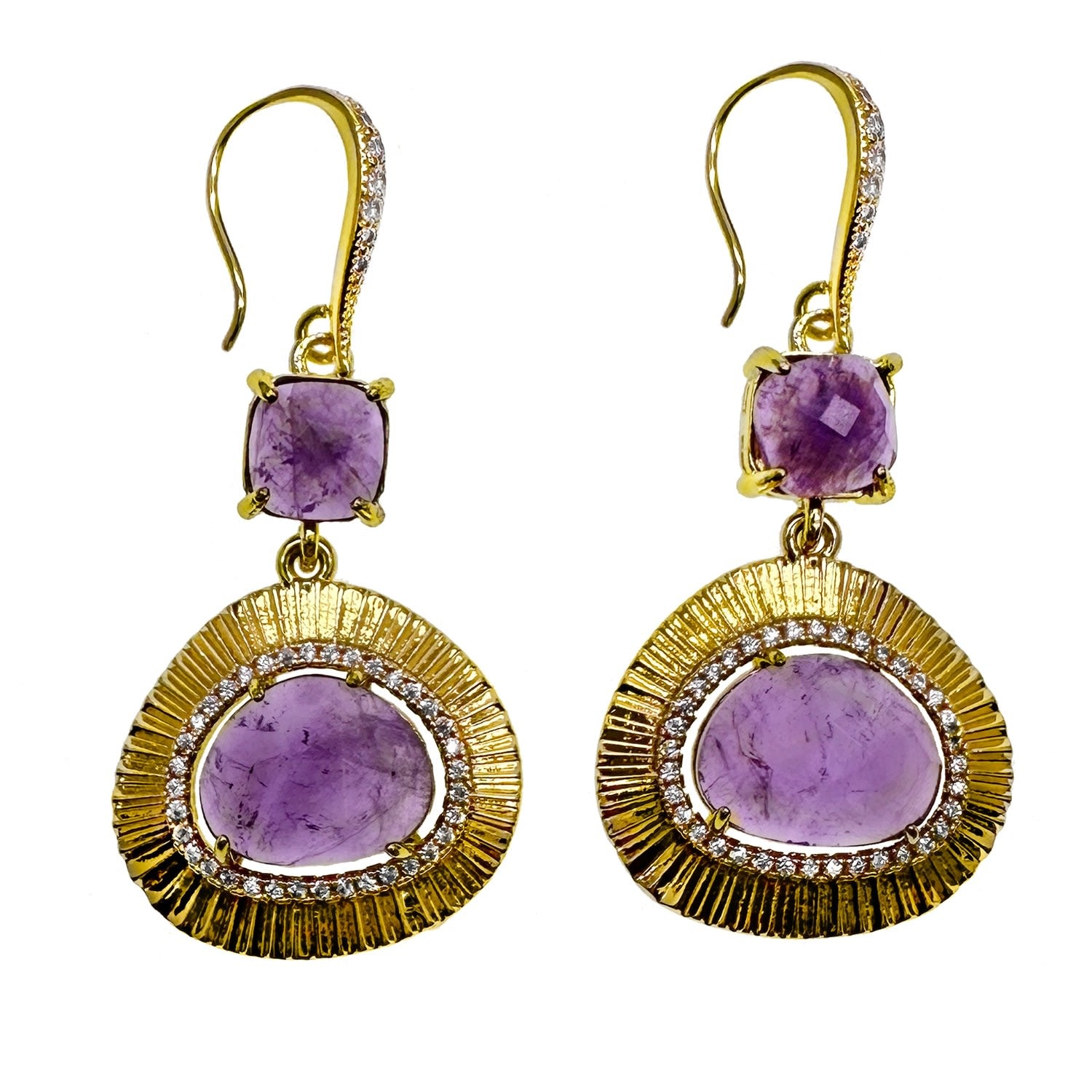 These dangle earrings are set with amethyst stones and have rhinestones on the hook. The metal is unspecified, but the size is approximately 5cm.