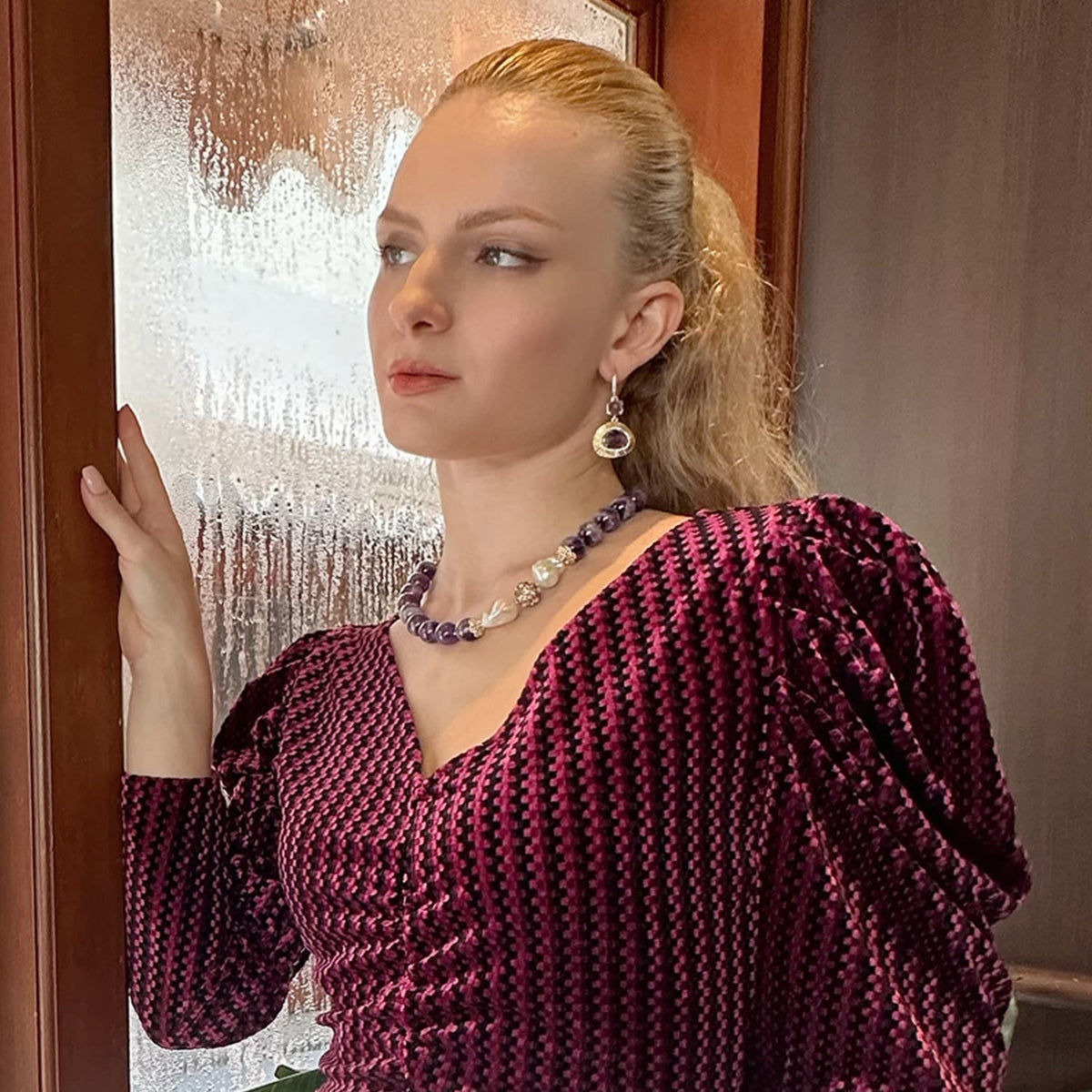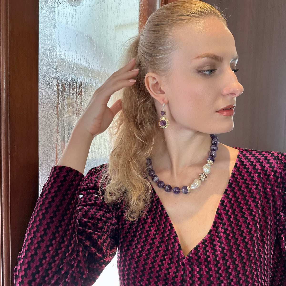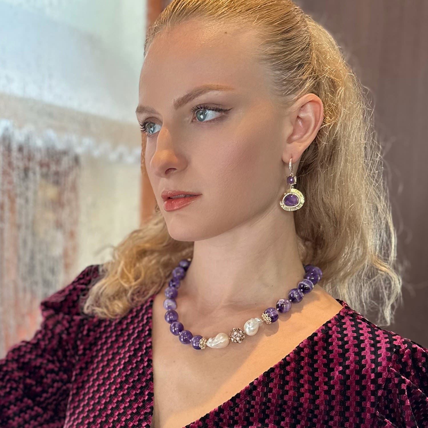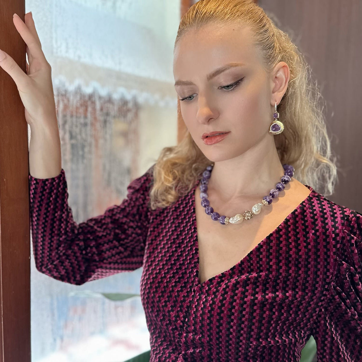 These dangle earrings are set with amethyst stones and have rhinestones on the hook. The metal is unspecified, but the size is approximately 5cm.