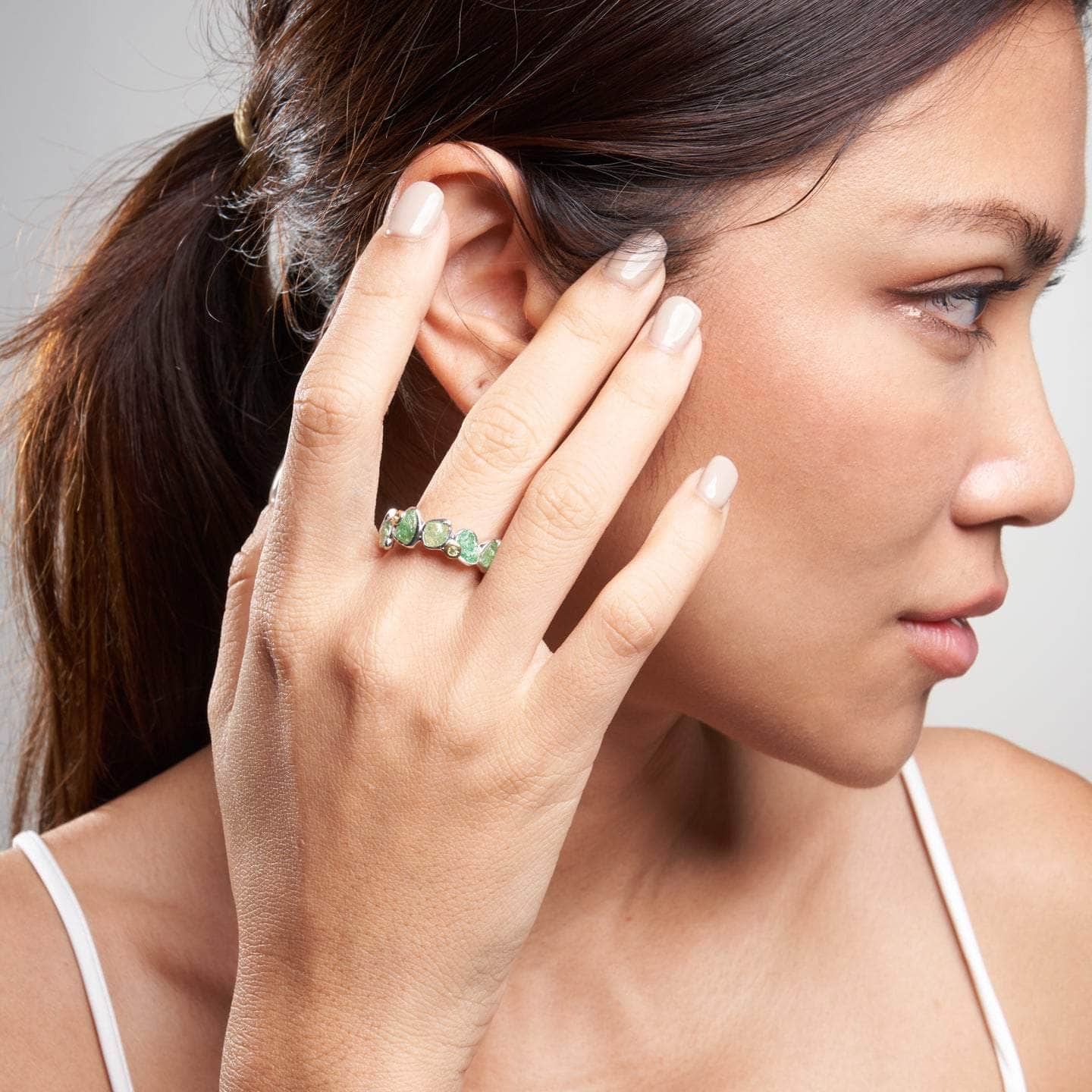 A striking combination of raw and cut gems in one ring: green tsavorite garnet and peridot dots next to each other to showcase wild beauty enhanced by the magnetism of simple geometric shapes.