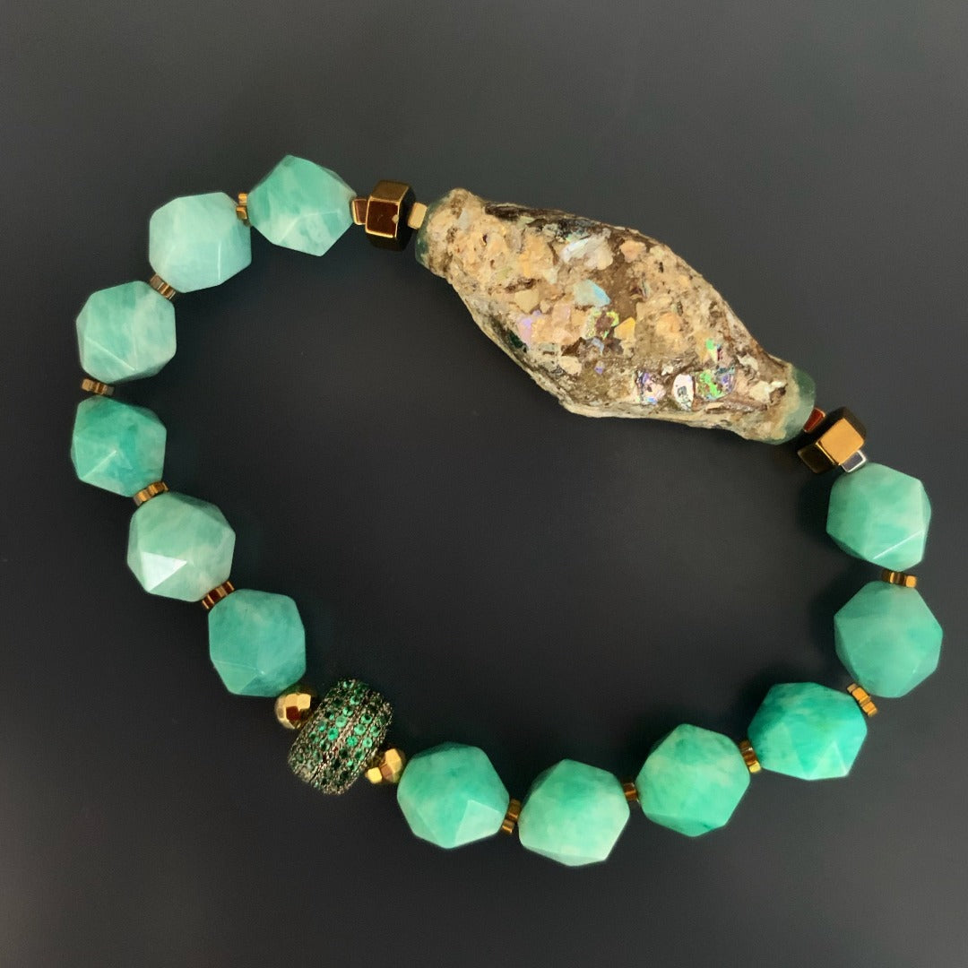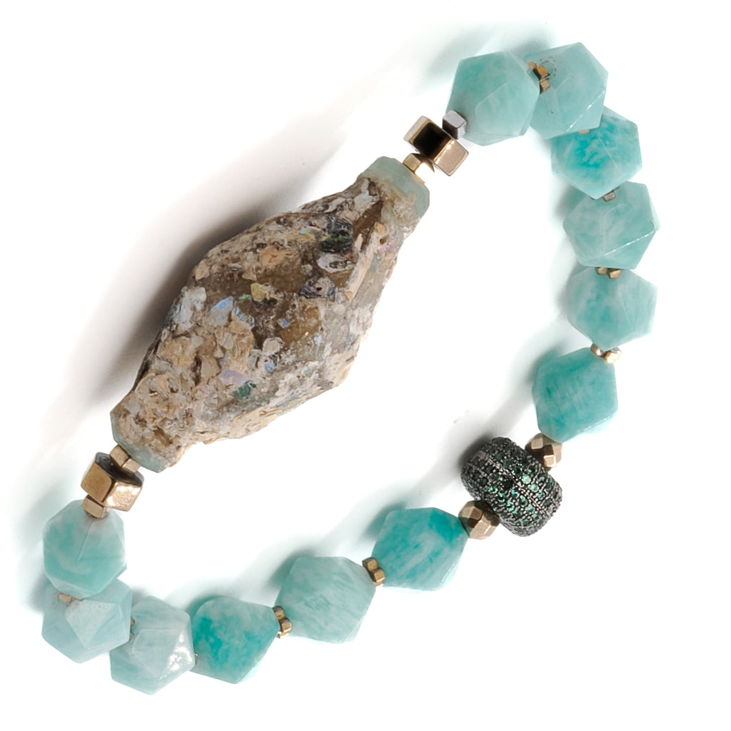 The Historical Bracelet is a captivating piece of jewelry that embodies a fusion of history, elegance, and timeless beauty. Crafted with exquisite attention to detail, this bracelet showcases a harmonious blend of semi-precious stones and a unique multicolor glass bead. Larimar stone is associated with tranquility, clarity, and emotional healing, making it a powerful stone that resonates with deep inner peace. The centerpiece of the Historical Bracelet is a beautiful multicolor glass bead, exuding a sense of timelessness and historical significance.
