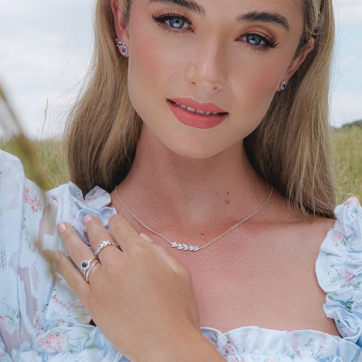 An elegant nature-inspired 9ct white gold ring with diamonds in a beautiful olive branch motif. The olive branch is a universally known symbol of peace.