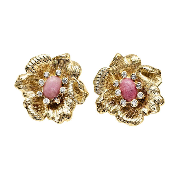 These stud earrings feature a rhodonite stone in a gold-toned flower setting with sparkling accents.