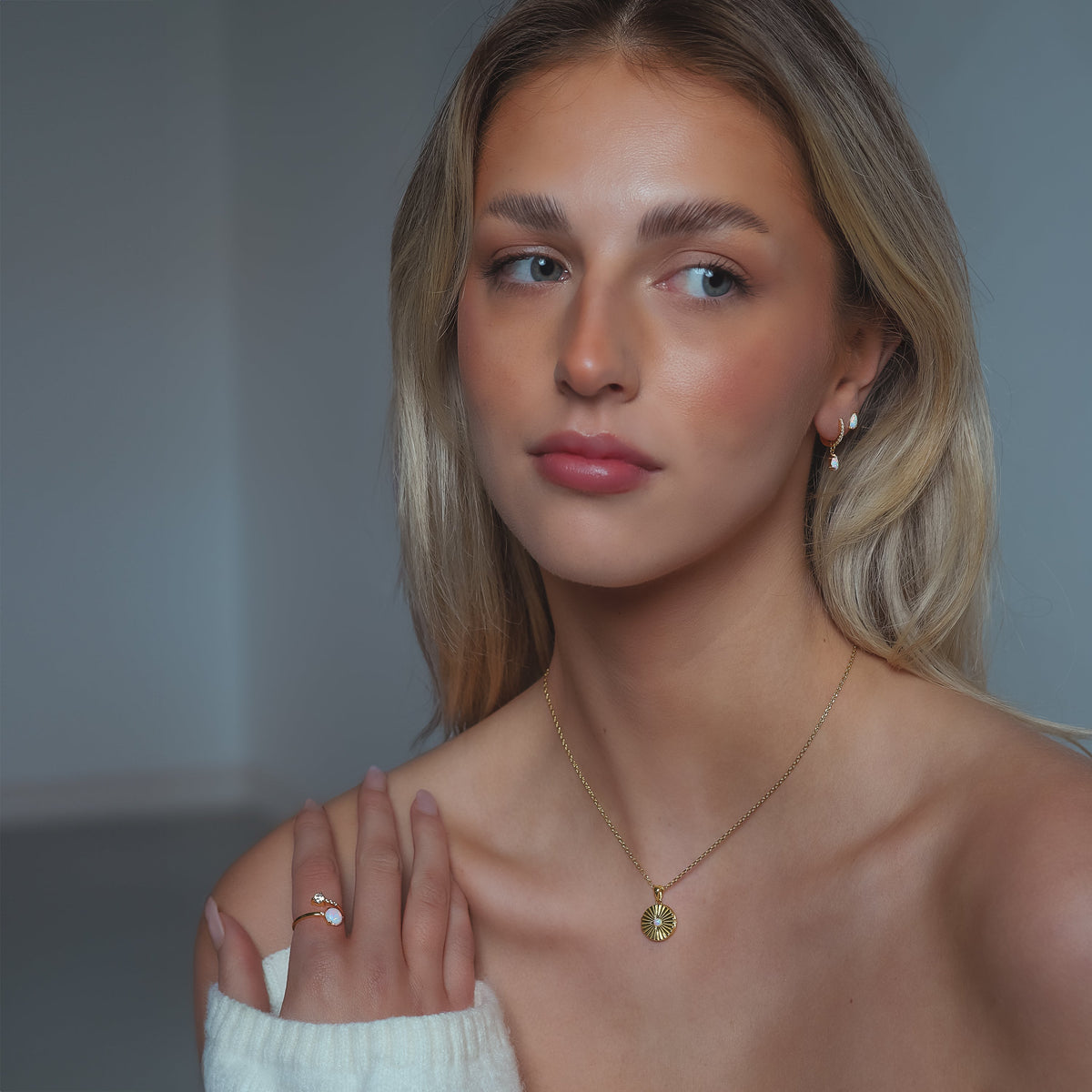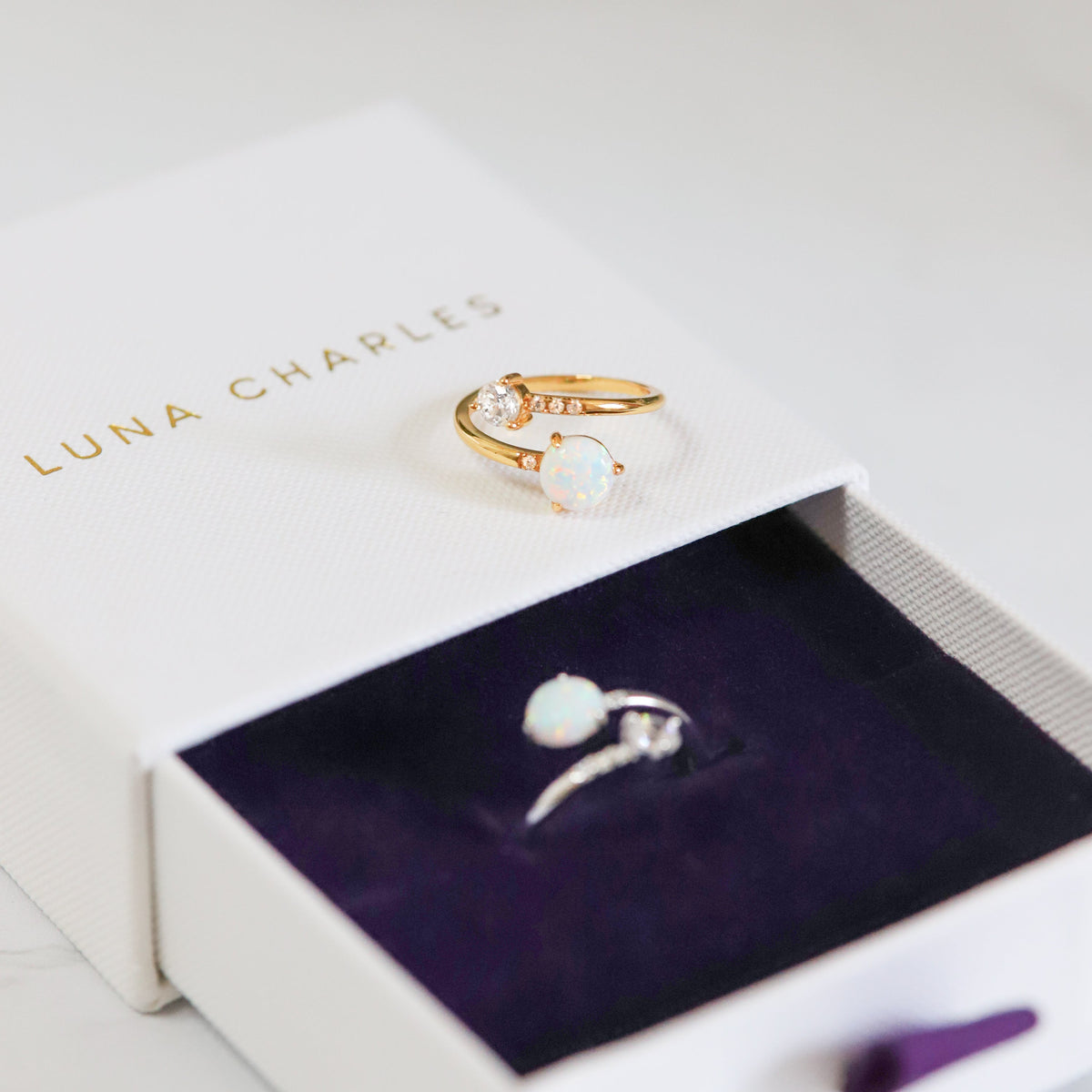 Anastasia is an open style ring that wraps around your finger. Featuring a circular opal stone inside a claw setting with a smaller crystal stone sitting opposite. Anastasia gives you the best of both worlds, a sparkling clear crystal and the enchanting colourful shine of a milky opal, a stunning piece to add to your jewellery collection, one that's guaranteed to get you compliments galore. Anastasia is a beautiful gifting option as it looks so special, there are also matching earring options with Eva Opal Charm Huggies & Clara Opal Studs. Presented in a gorgeous box with gift wrapping available, making a perfect present for someone special.