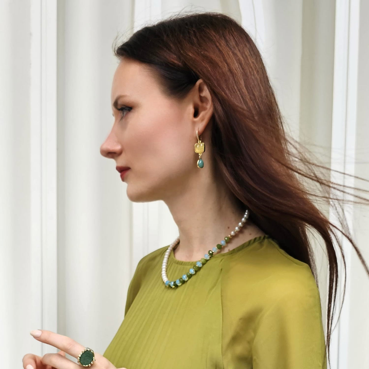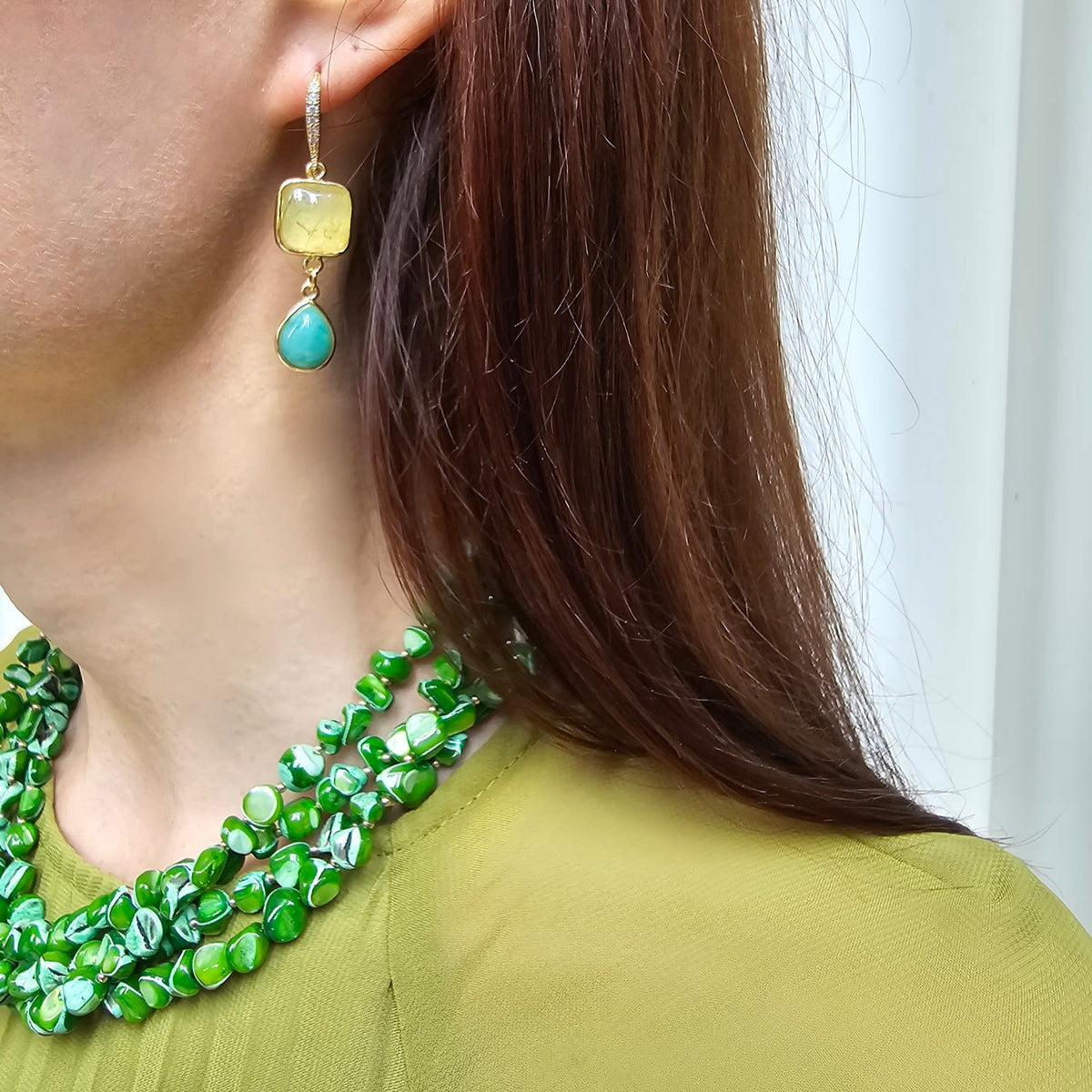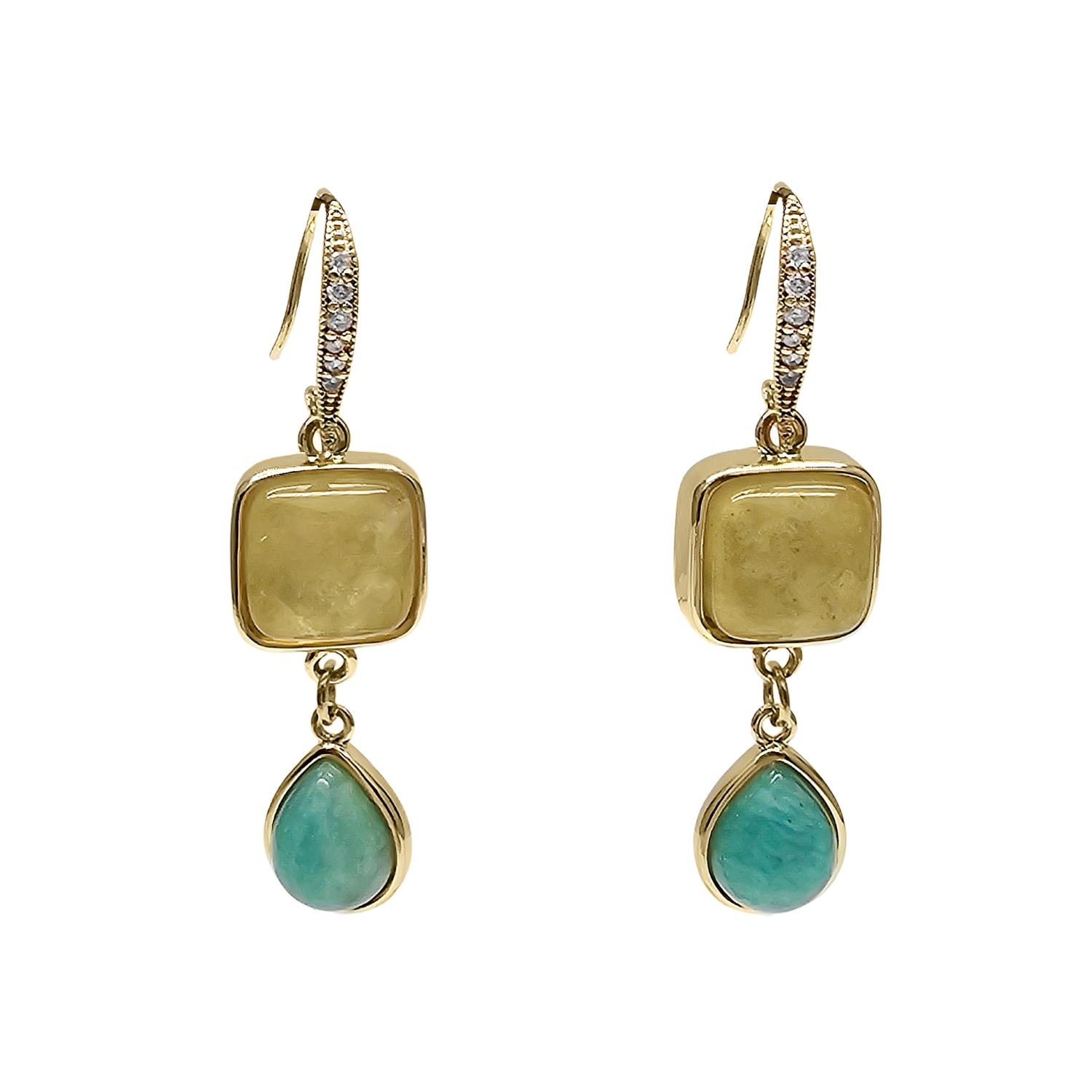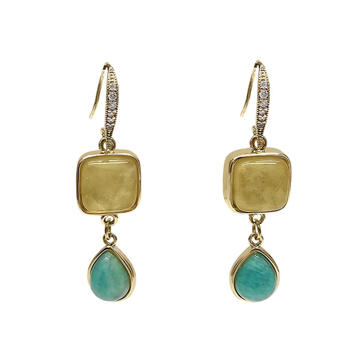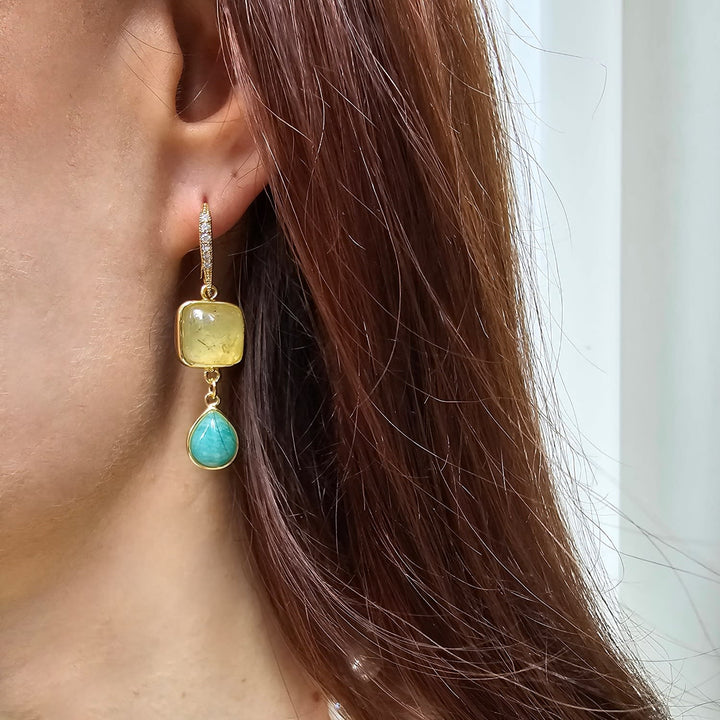These earrings are crafted with natural citrine and green amazonite stones. They have a gold-tone setting.
