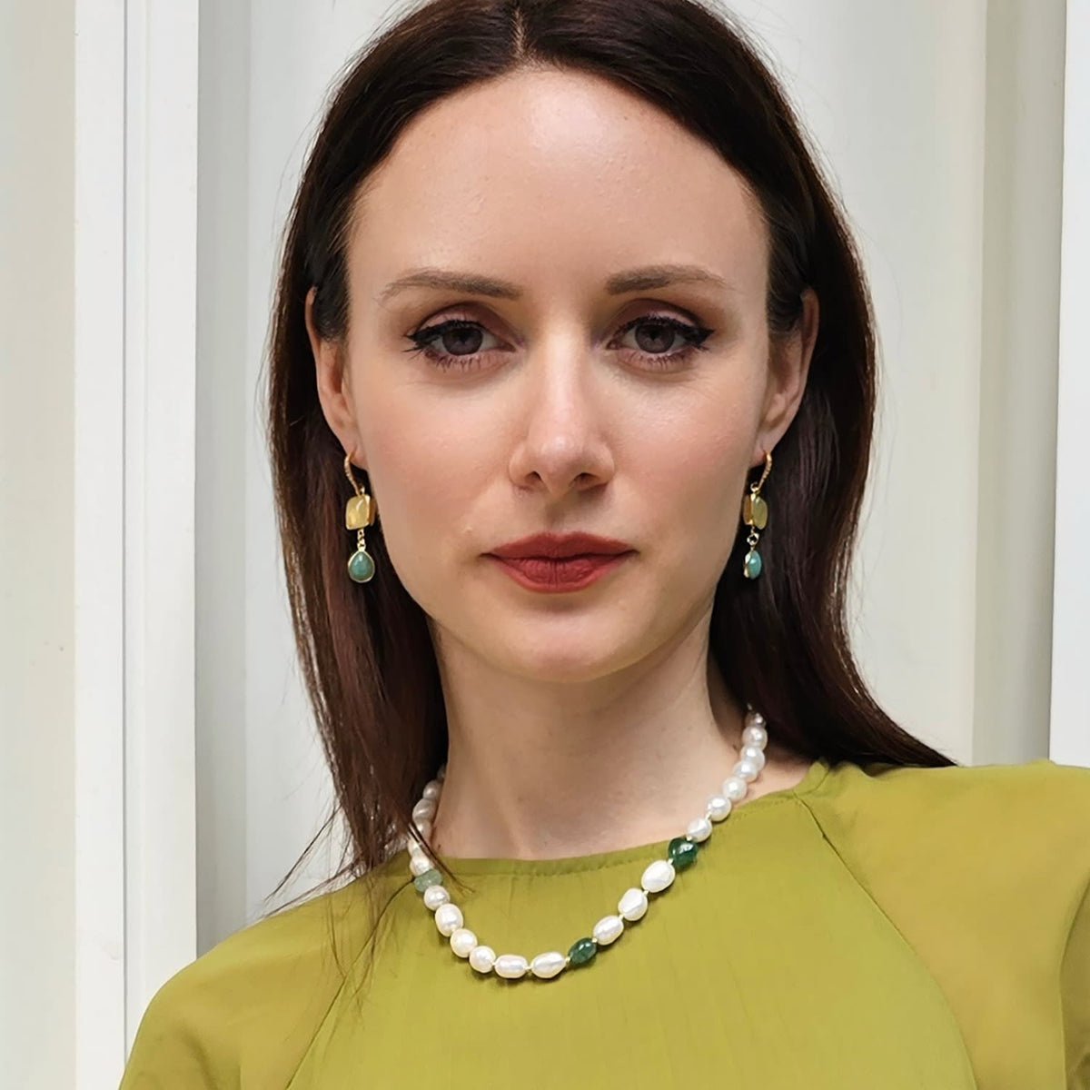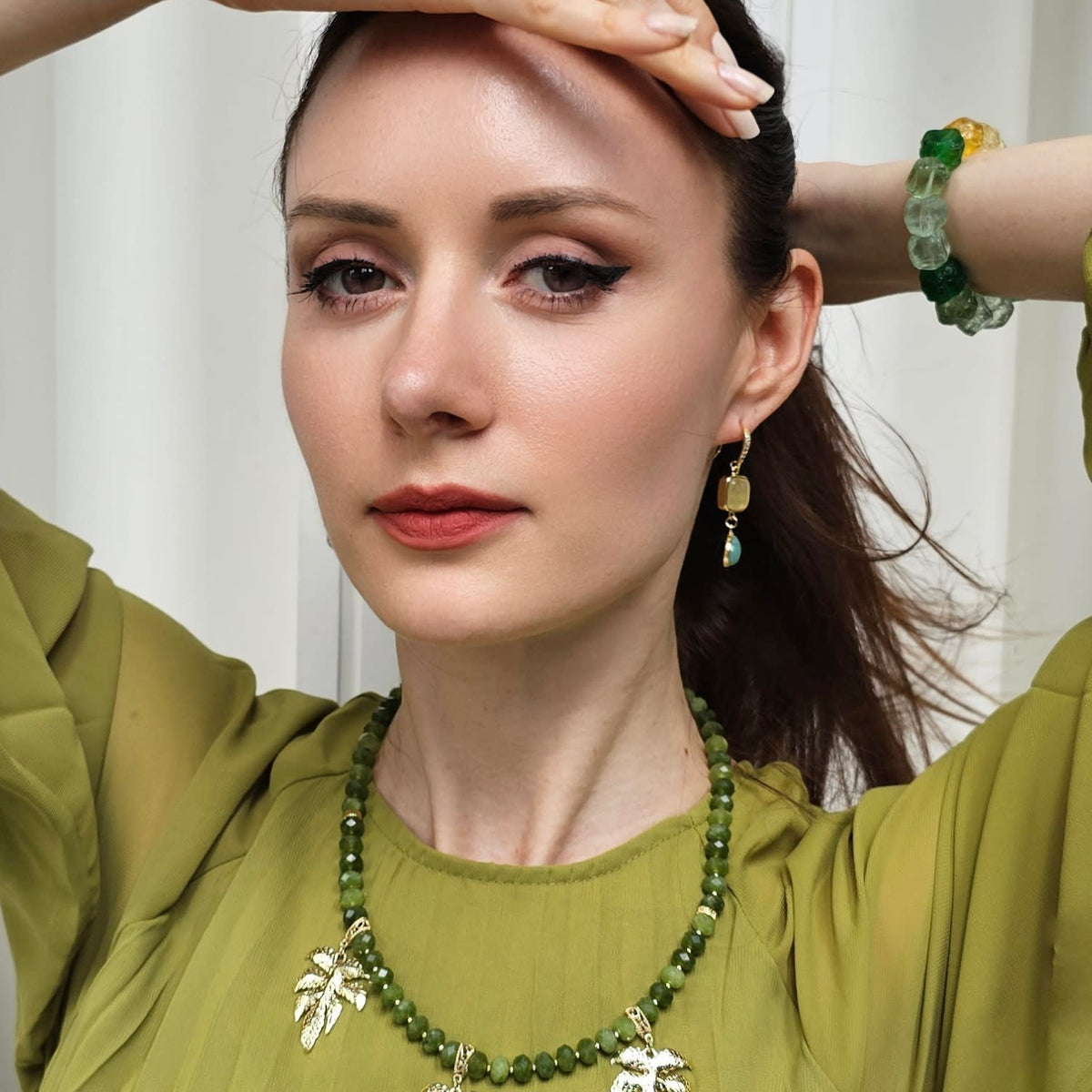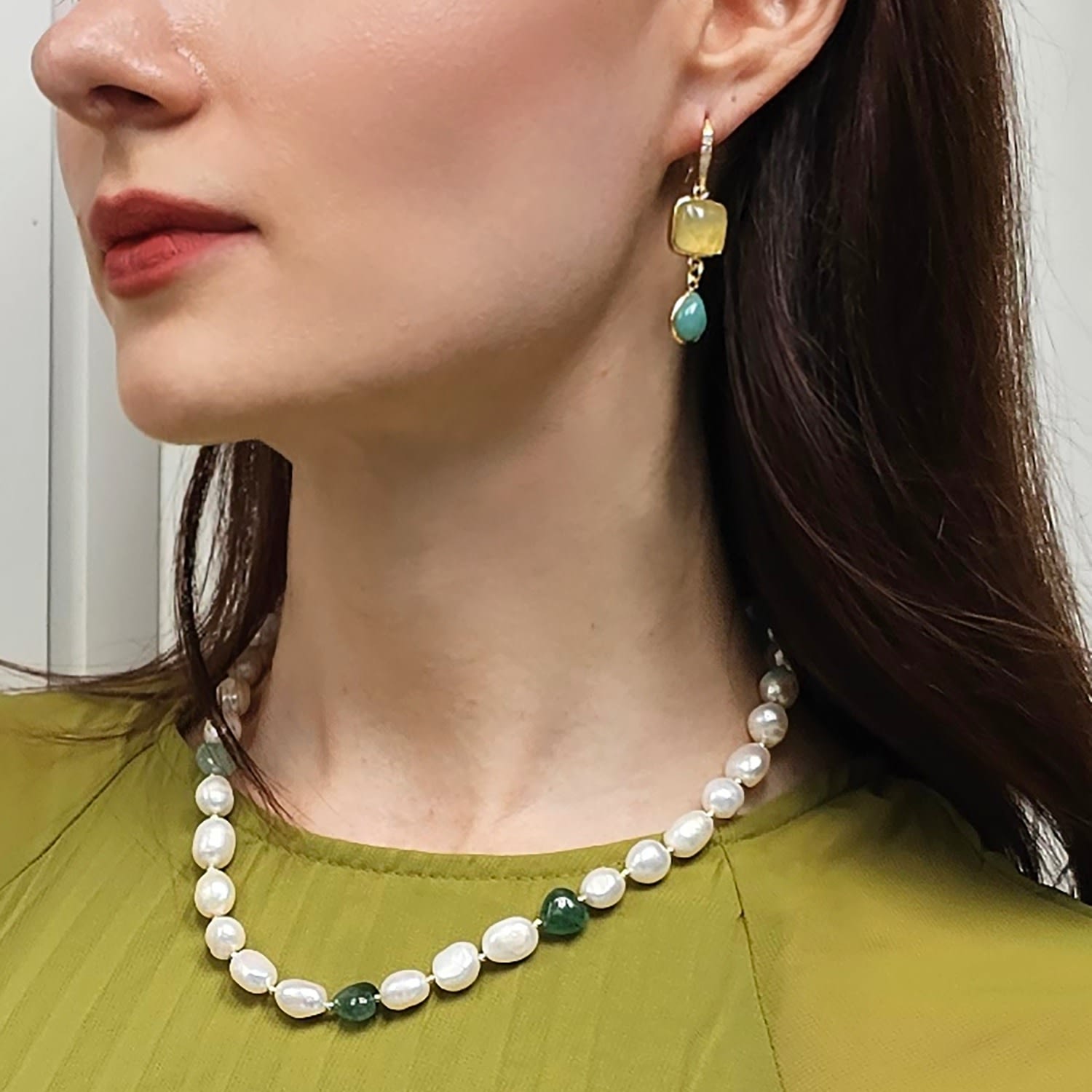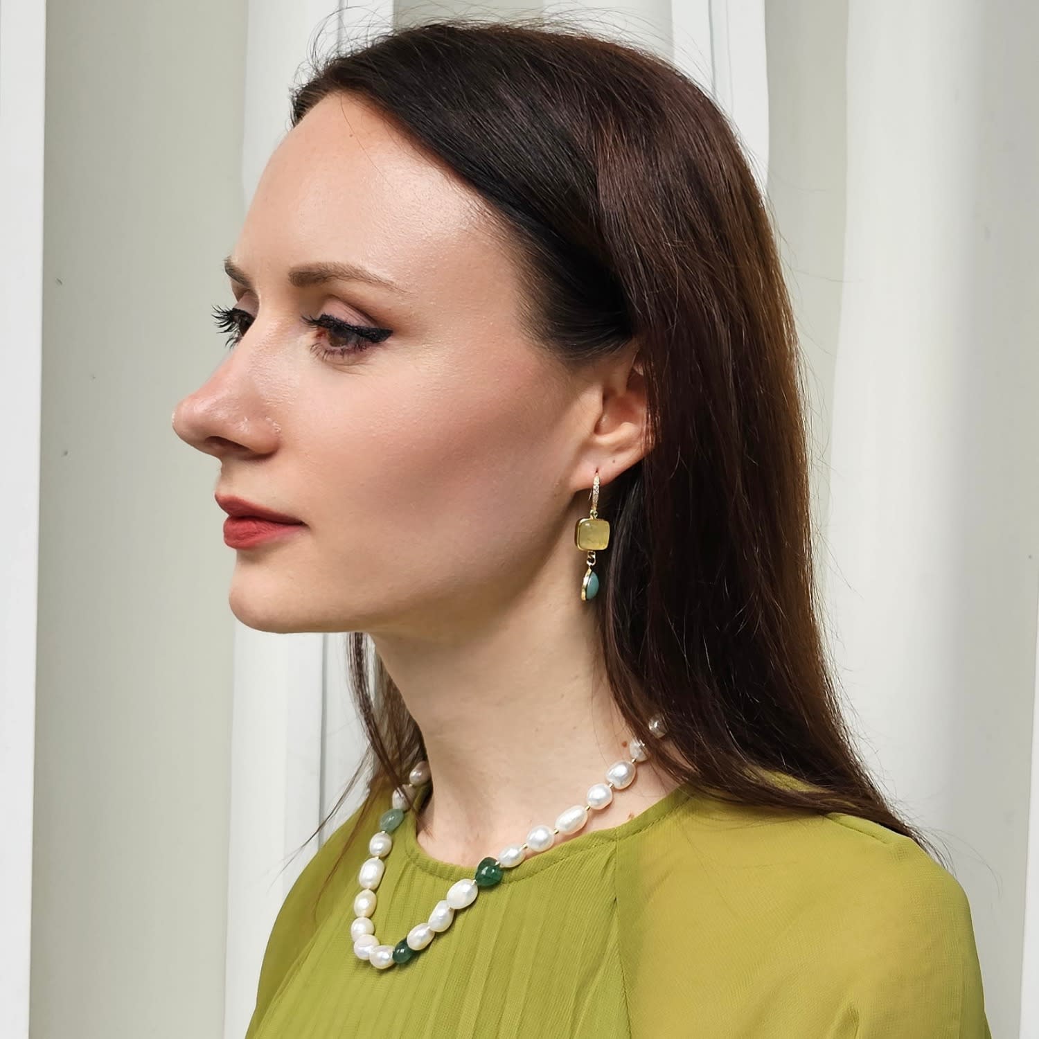 These earrings are crafted with natural citrine and green amazonite stones. They have a gold-tone setting.