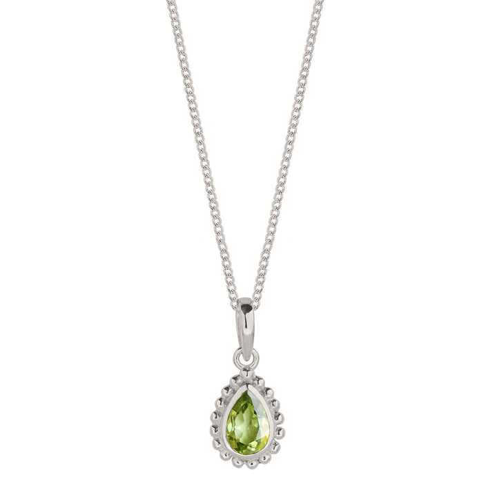 This August Birthstone Sterling Silver Necklace by Charlotte's Web Jewellery is a radiant and joyful accessory that celebrates positivity and a touch of magic. The fresh green peridot gemstone is nestled in a pear-shaped Rawa setting, a design that beautifully blends Indian heritage with a contemporary feel. This necklace is a personal and meaningful piece that brings a fresh sparkle to your style, whether you wear it alone or layer it with other pieces.