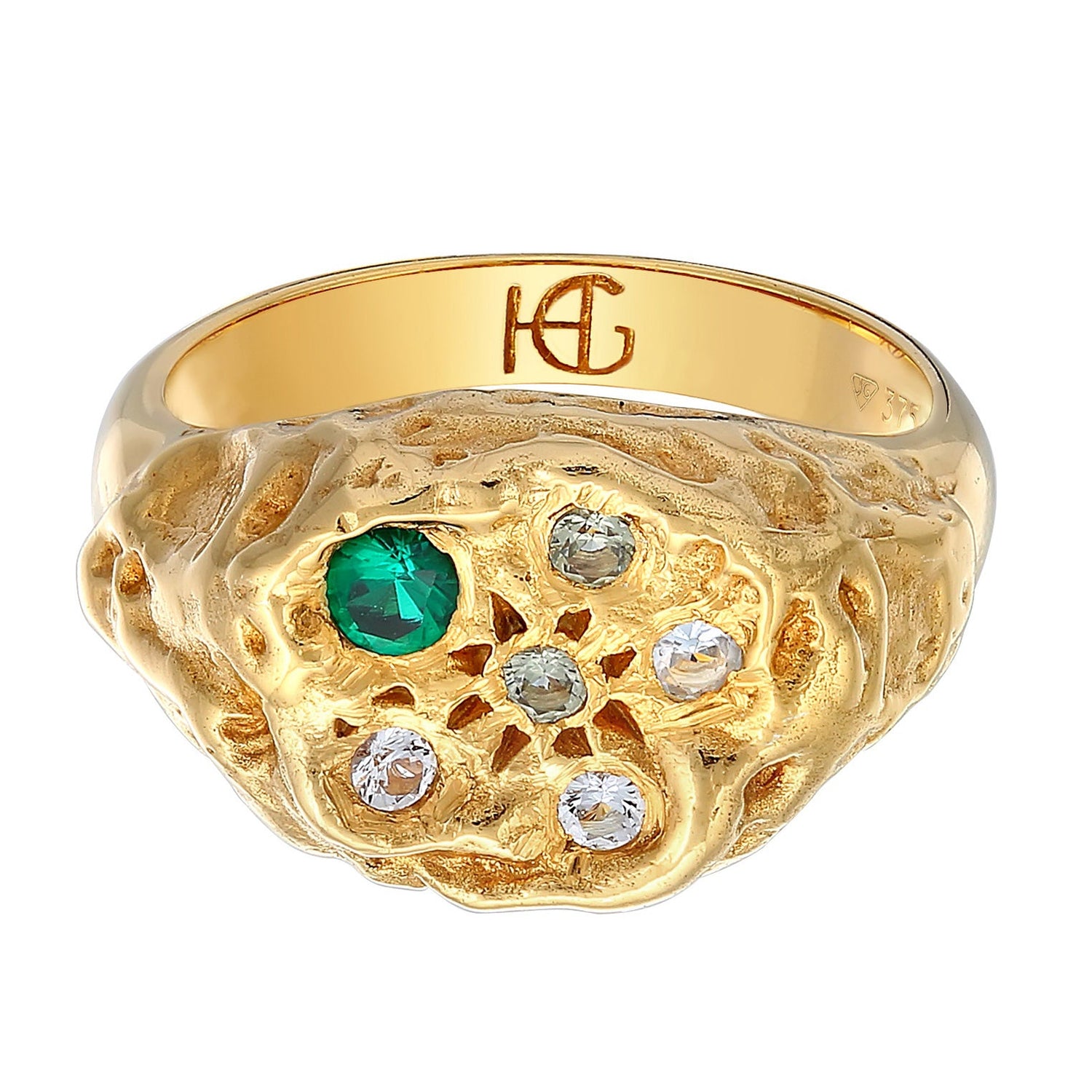 This solid real gold cocktail ring is a tribute to the glam 70's Studio54 era, The Clementine Ring is the perfect signet ring for the trendy Gypset look. Gypset is a combination of the laissez-faire hippie look and the elegant modern jet set look. The Gypset look is especially represented among artists, designers, musicians and 'bons vivants' who often live and work anywhere in the world. For this ring we used 3 aquamarine as well as tourmaline and emerald gemstones. Made from 375 solid gold, this product does not tarnish or change colour but we still recommend not to wear it in sea water