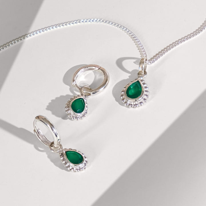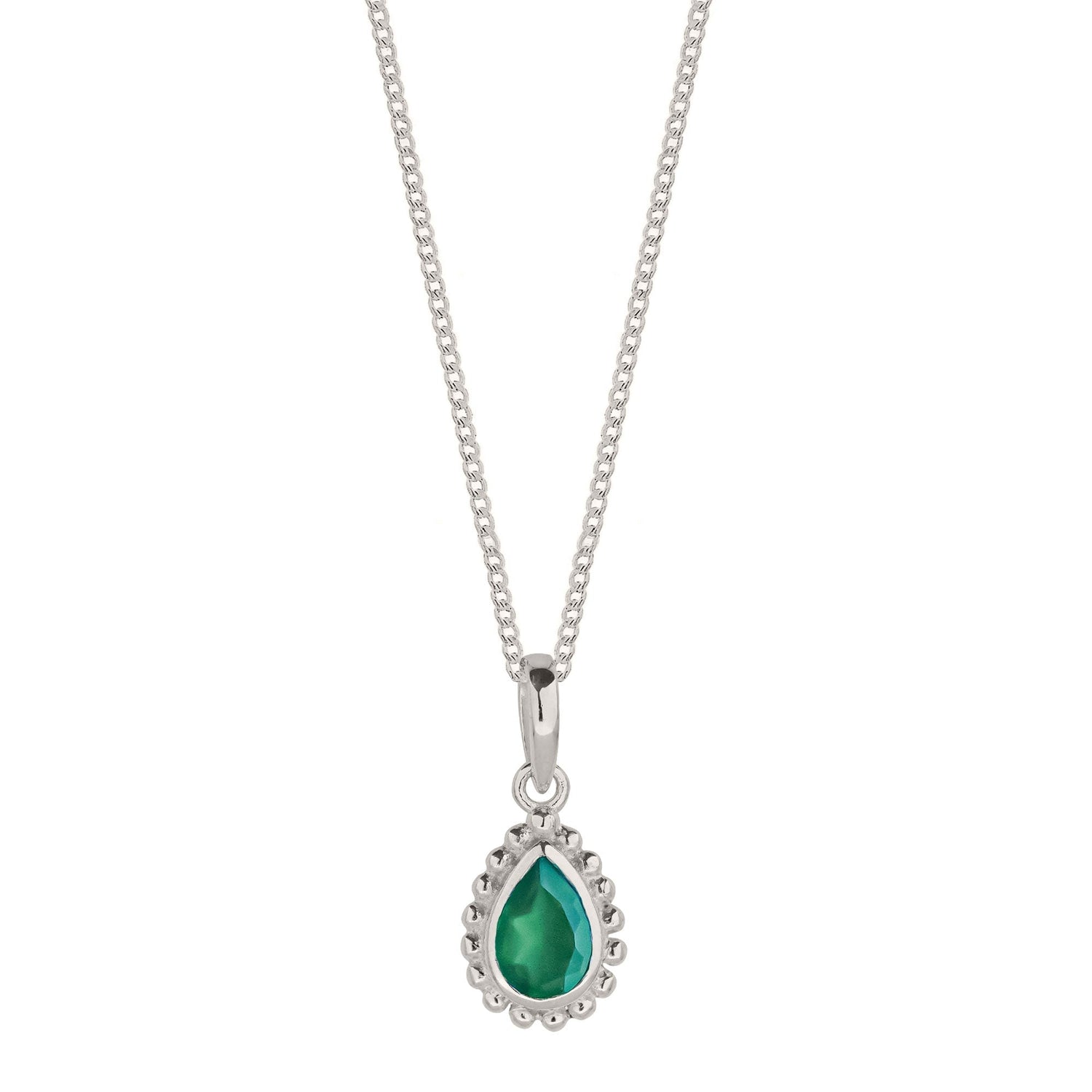 This May Birthstone Sterling Silver Necklace - Green Onyx by Charlotte's Web Jewellery is a bold and empowering accessory. It features a pear-shaped Green Onyx stone, the birthstone for May, which promotes strength and self-confidence. The necklace is handmade in India and is made of sterling silver and Green Onyx. It is also hypoallergenic and nickel-free.