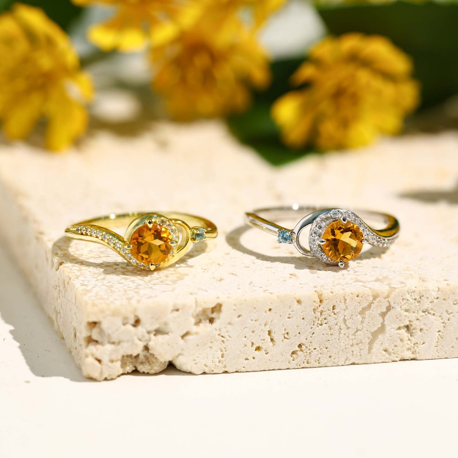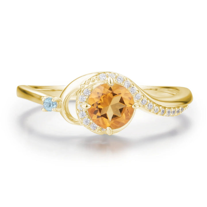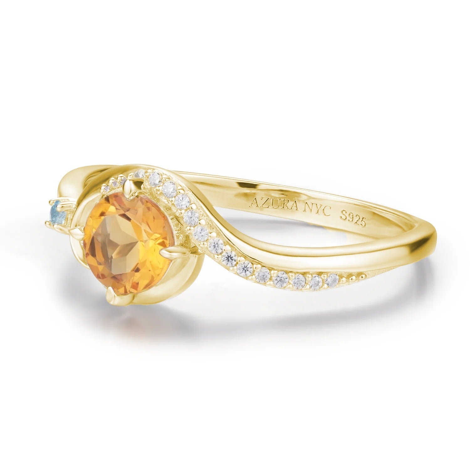 Elevate your style with our Air Ring, inspired by the element of air. This ethereal design features a round citrine, representing the uplifting energy of the breeze. The airy and wavy band, accented with white topaz stones and aquamarine on the side, captures the lightness and freedom found in the gentle movement of air. Embrace the gentle breeze of change, letting it guide you to new heights, where freedom and grace intertwine in the dance of life. Made in 14K yellow gold vermeil (14K yellow gold plated over a sterling silver base).