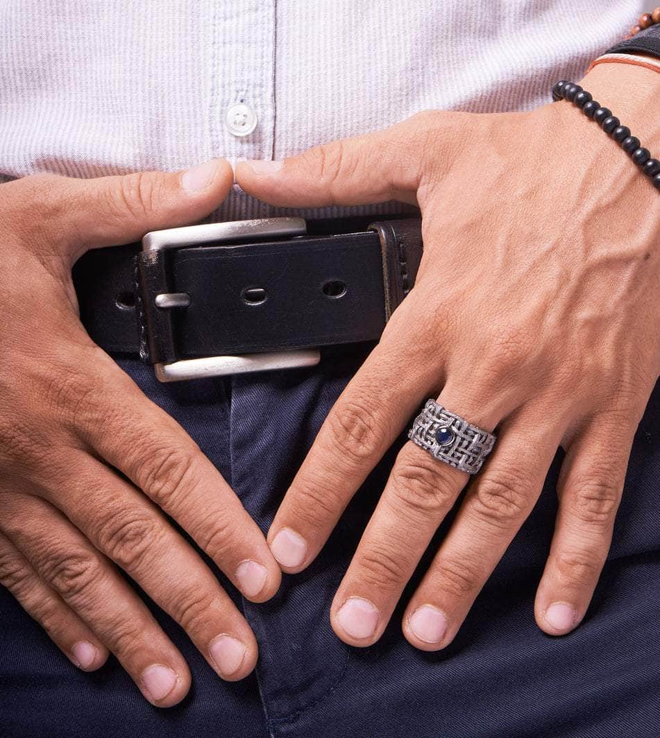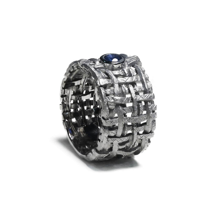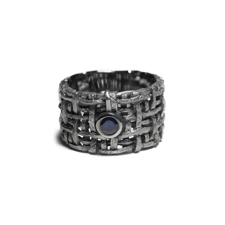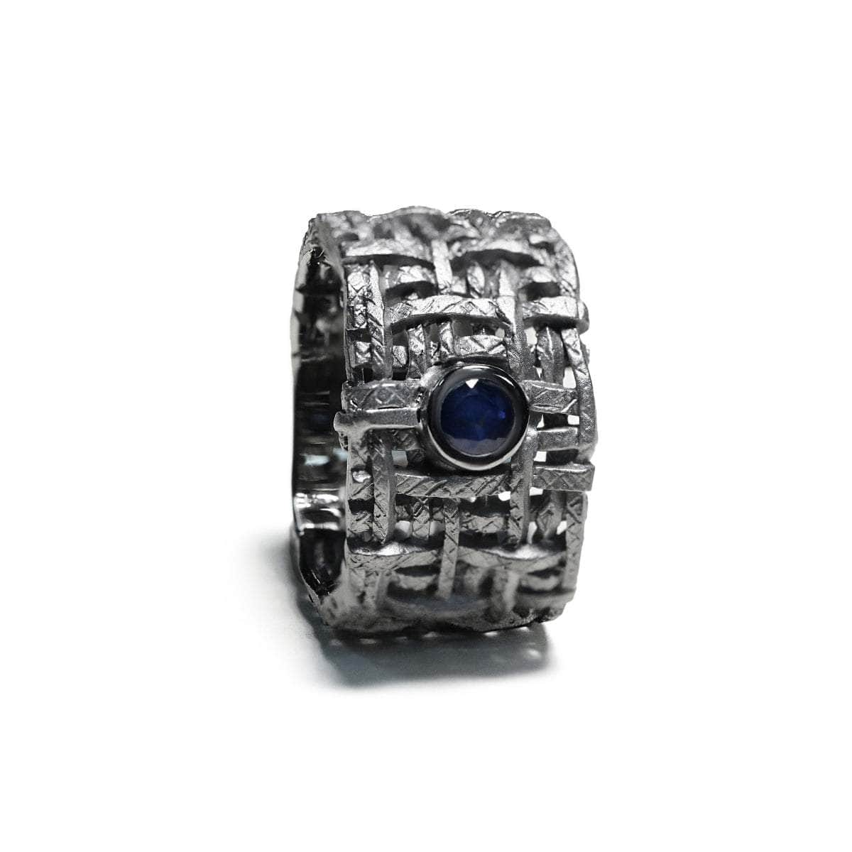 Latticework weaves its ancient shape around the black rhodium barrel of this ring. It echoes back to ancient times and mystical practices. A glimmering blue sapphire sits centrally offering a commentary on the beauty of the soul and the eternal life of the gemstone.