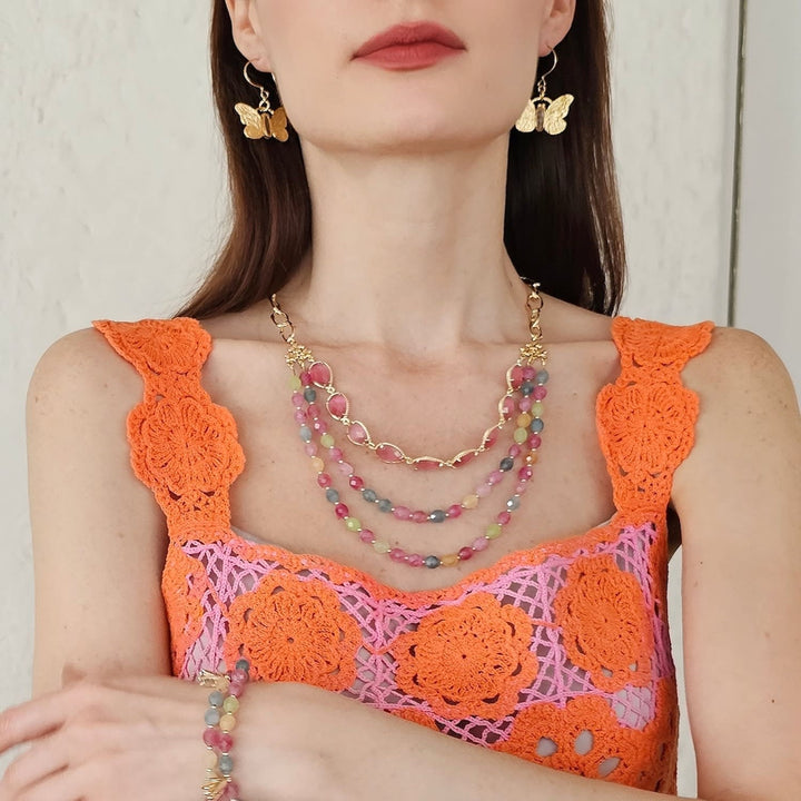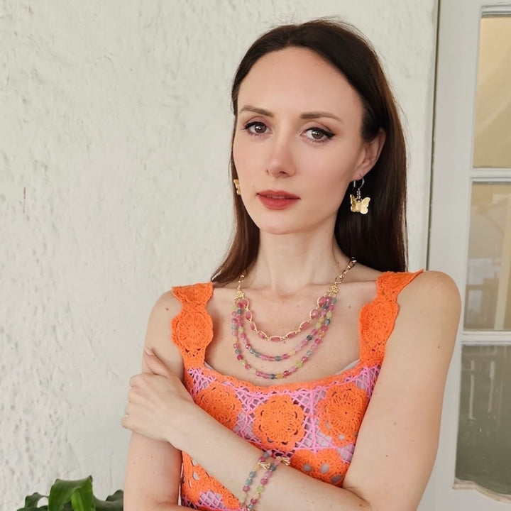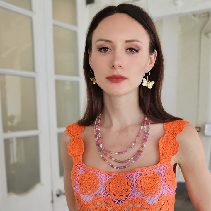 These Gold Butterfly With Rose Quartz Stone Earrings by Farra are a whimsical and elegant accessory. These earrings feature a delicately crafted butterfly design, symbolizing transformation, and the soft pink hue of a rose quartz stone, which adds a touch of romance. The stunning gold-tone finish enhances their elegance, making them perfect for special occasions or adding a whimsical touch to your everyday look.