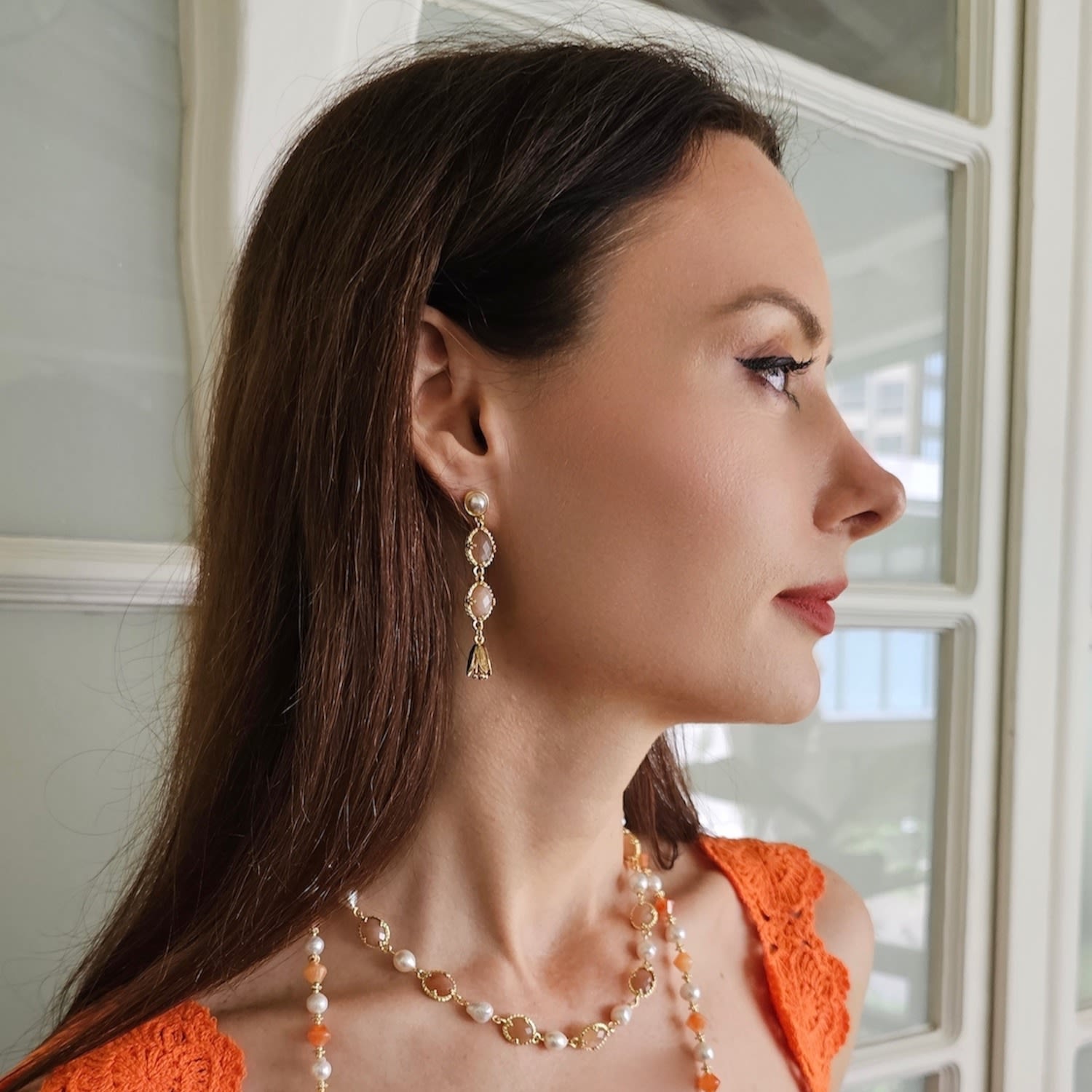 These earrings are crafted with polished sunstone and pearl stones, featuring gold-tone accents and a secure stud backing.