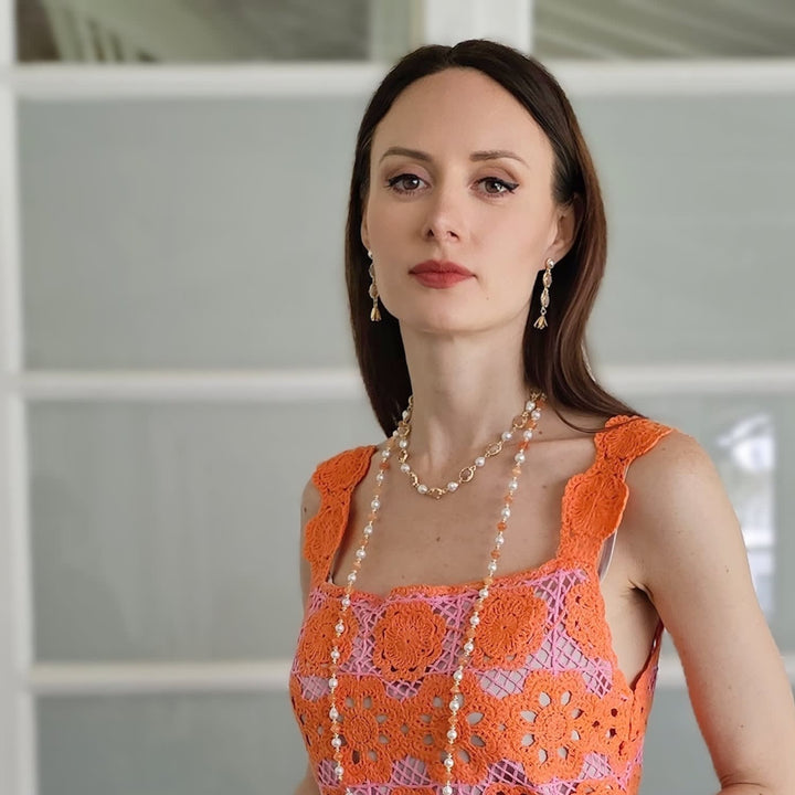 These Sunstone Dangle Stud Earrings by Farra radiate with warmth and natural beauty. The elegant design features a polished sunstone at the center, known for its inspiring energy, gracefully suspended from a lustrous pearl at the top, adding a touch of classic sophistication. The gold-tone accents enhance the overall elegance and artistry of the piece. With their eye-catching length and unique design, these earrings are perfect for making a bold statement on special occasions or adding a refined touch to your everyday look.