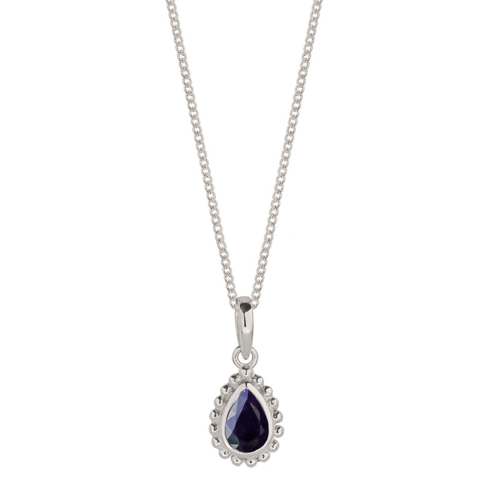 This September Birthstone Sterling Silver Necklace - Black Sapphire by Charlotte's Web Jewellery is a sophisticated and grounding accessory. It features a unique black sapphire, an edgy take on the September birthstone, set in a detailed pear-shaped Rawa frame. Handcrafted in India, this piece is said to offer protection and insight, making it a powerful and eternal symbol for the wearer. It is also hypoallergenic and nickel-free, and comes with a complimentary birthstone card.