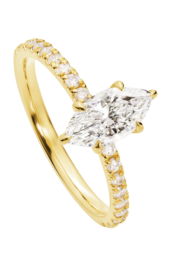 Our Maeve engagement ring is crafted in 18ct yellow gold and set with a mesmerising marquise cut diamond solitaire and glittering pavé band. An intricate halo of diamonds hide beneath the centre stone for a fresh take on a classic style and even more sparkle. The Maeve ring is set with a total of 1ct of dazzling lab grown diamonds. The 0.75ct G VS2 marquise cut centre stone is IGI certificated and comes with a full diamond certificate.