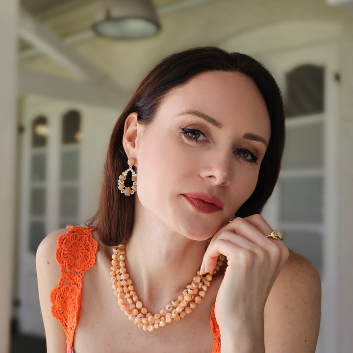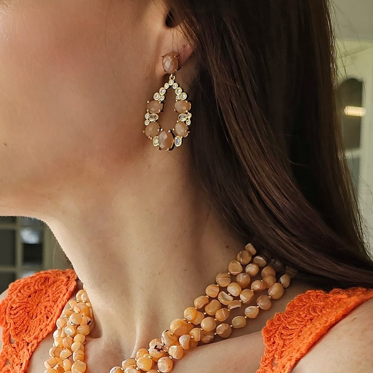 These Sunstone Statement Earrings by Farra are an elegant and sophisticated accessory. They feature beautifully faceted sunstone set in a sparkling teardrop frame. The warm hues of the sunstone are complemented by shimmering accents, creating a stunning contrast that enhances your natural glow. Their unique teardrop shape adds a touch of drama, making them perfect for any occasion.