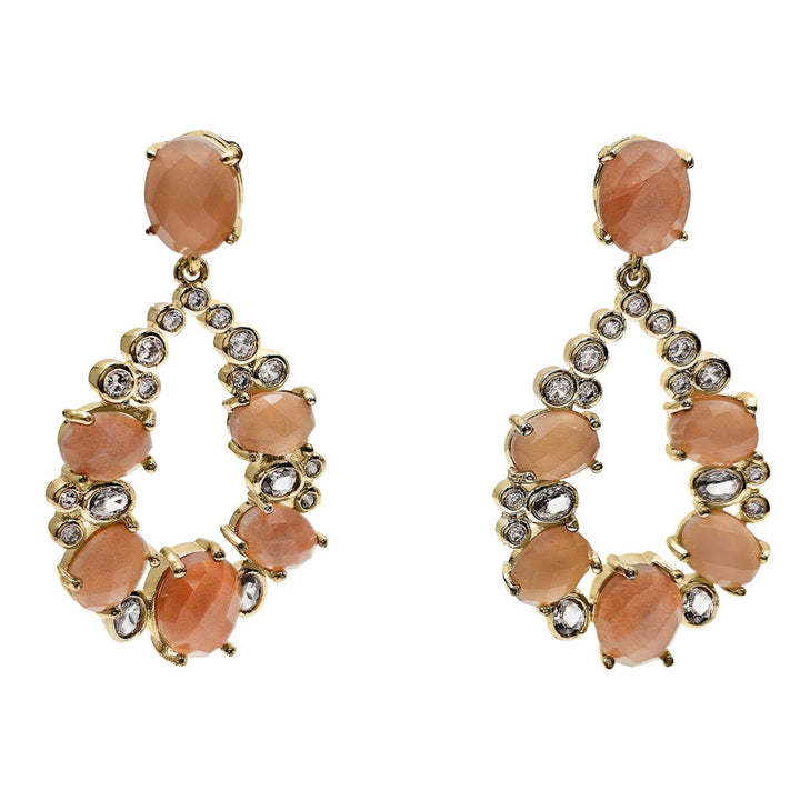 These earrings are set with a sunstone and have a teardrop frame. The specific metal is not specified.